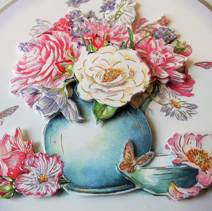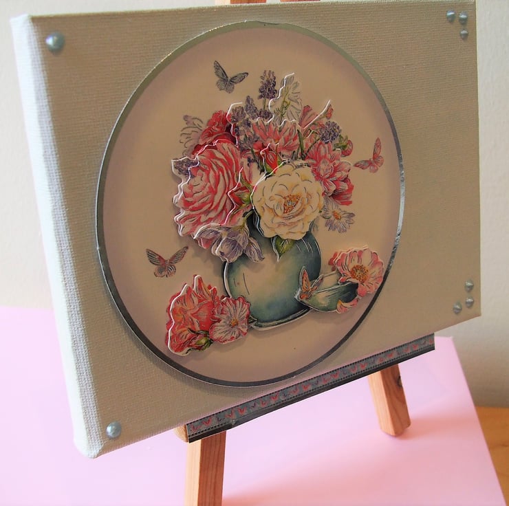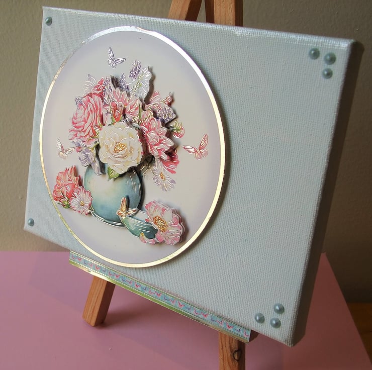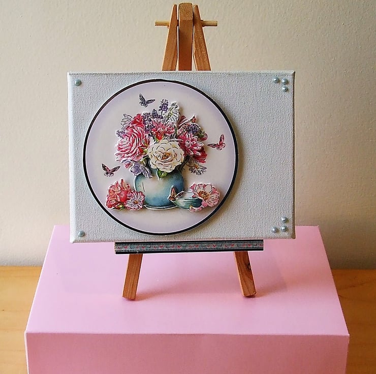 The canvas has been colour-washed a pale turquoise-blue and the edges highlighted with a pearly finish.The image has been decoupaged using 3D glue between each layer to give dimension to the flowers. I've added pale blue pearl drops to the corners and a piece of matching decorative border to the easel support. It comes with a handmade gift box in pink and white.