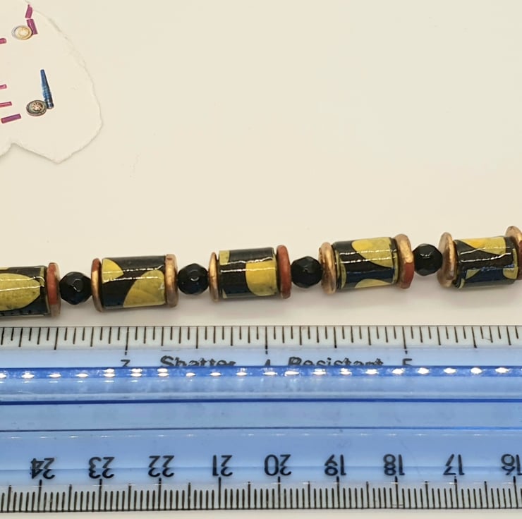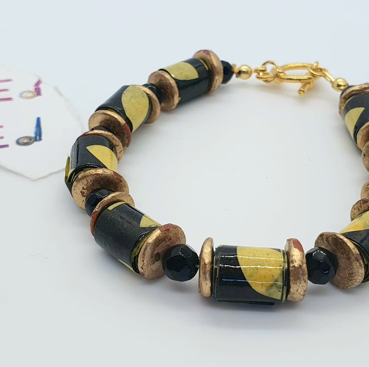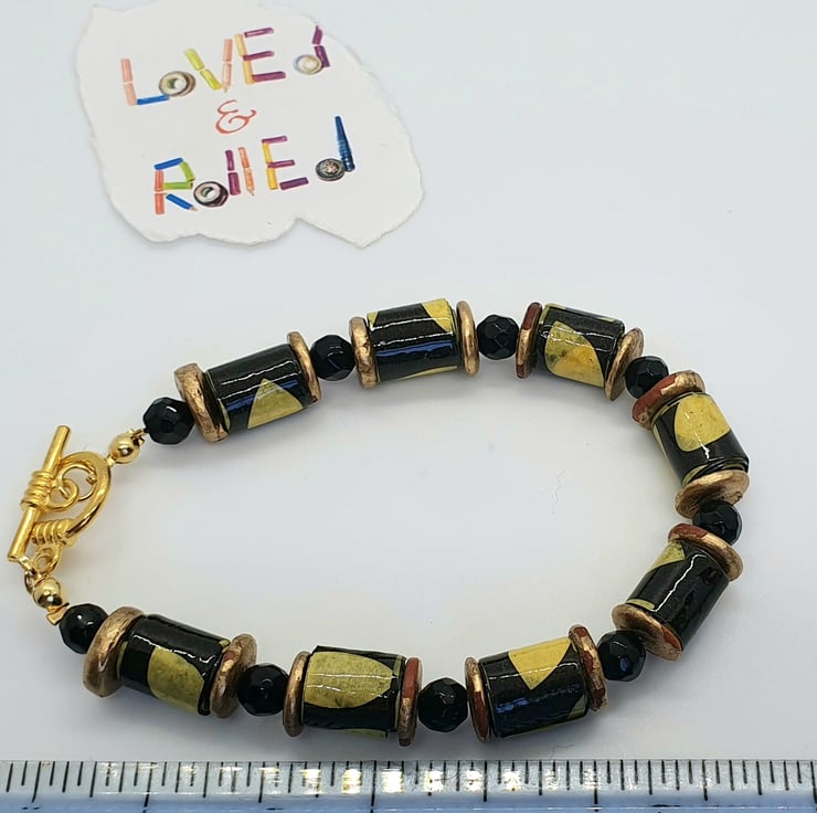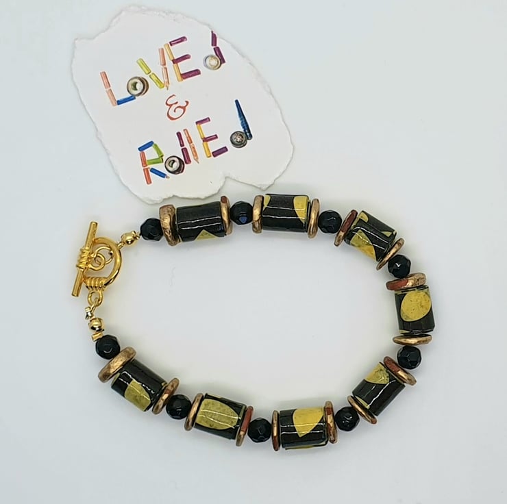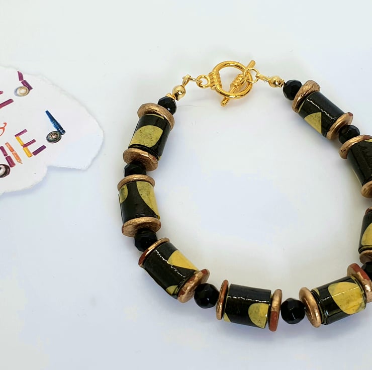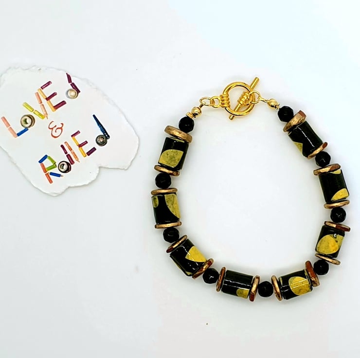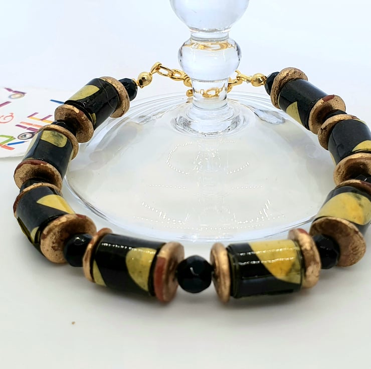 A bracelet made with recycled paper which has been cut into strips and hand rolleld into beads which were then varnished. The beads were then complemented with preloved shiny round black glass beads and preloved golden bronze beads to give the necklace an african feel. The clasp is gold plated. Dimensions as per photo.