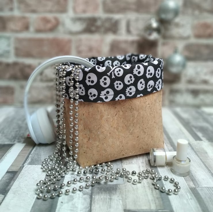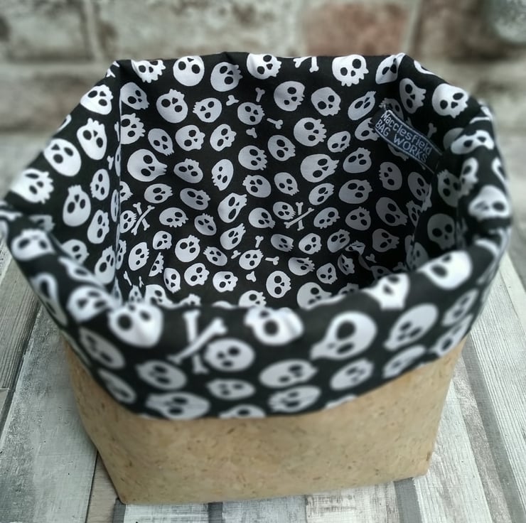 This stylish storage basket is carefully hand-made using natural cork coated cotton fabric and lined with a quirky, gothic skulls print polyester cotton lining. The cork has very subtle silver coloured flecks running through it.