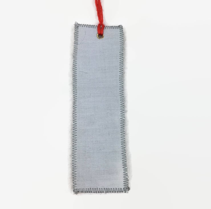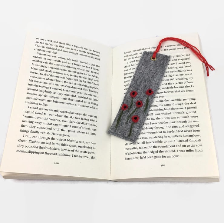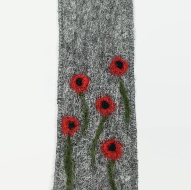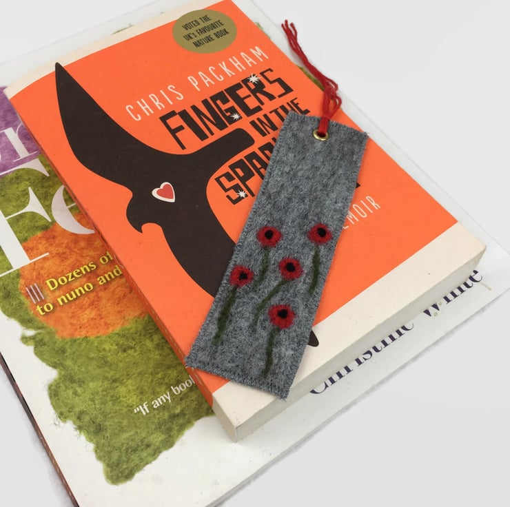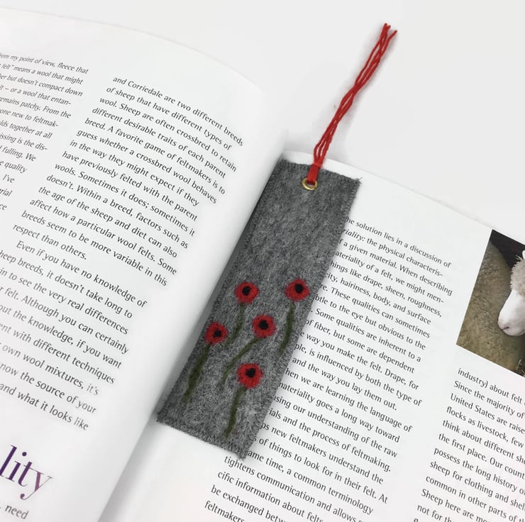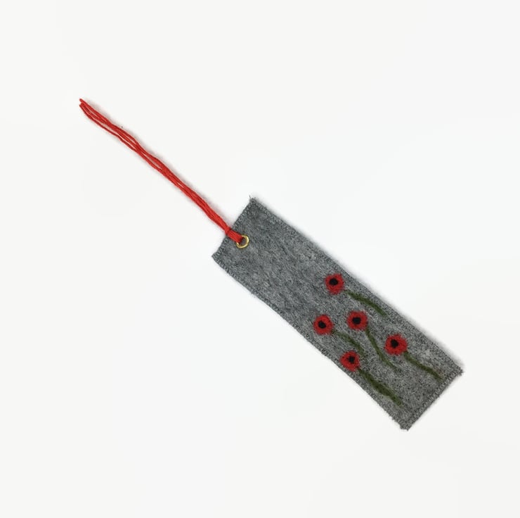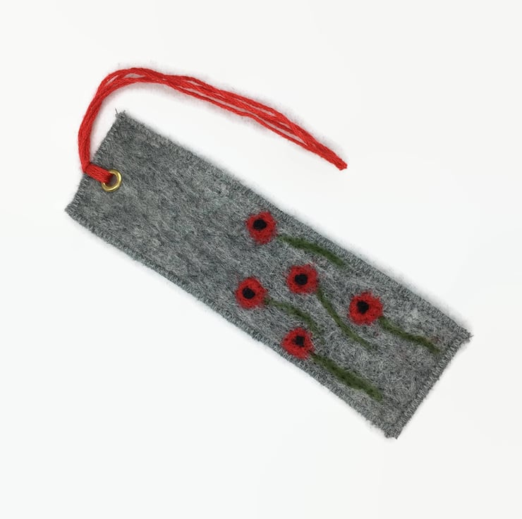 This bookmark has been made using a piece of hand made felt onto which a poppy design has been added using a needle felting technique. The book mark is then lightly stiffened with interfacing and backed with a grey polycotton fabric. A brass rivet has been added to the top of the bookmark and a red embroidery thread tail inserted.