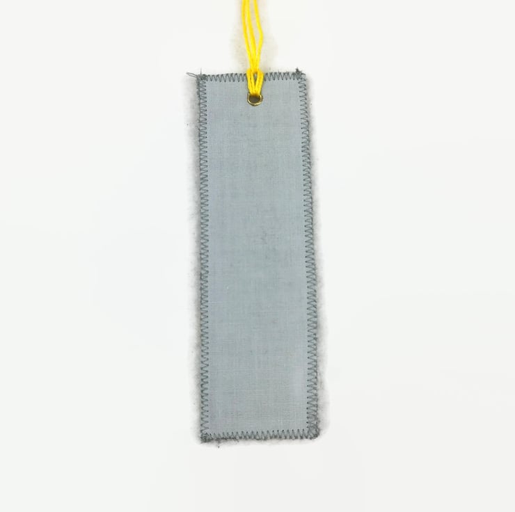 This grey felt bookmark has been made using a pice of hand made felt onto which a couple of brightly coloured butterflies have been needle felted. It has been backed with a grey polycotton fabric and slightly stiffened using interfacing. The edges have been stitched together and finished using a zig zag stitch. A yellow "tail" has been added using yellow embroidery thread fastened through a small brass rivet on the upper edge of the bookmark.