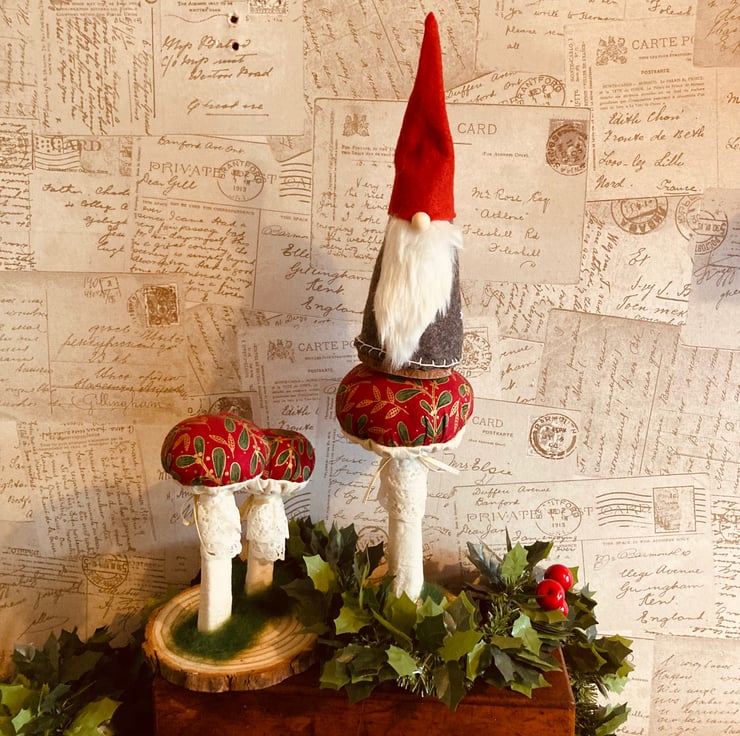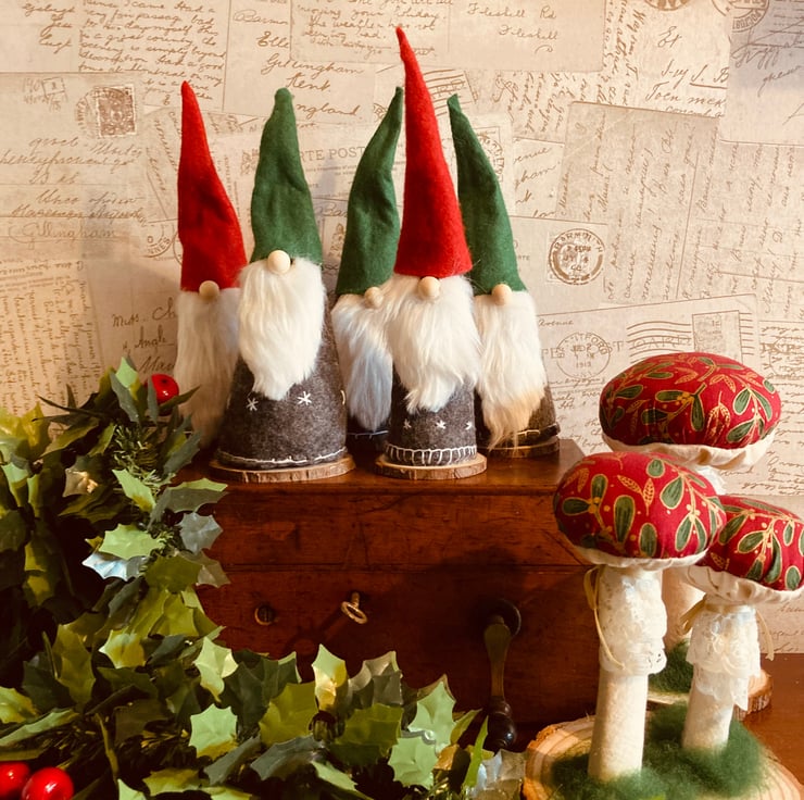 These little fellows are made from felt and have furry beards. They are all handmade and have tiny embroidered snowflakes around the bottom. They stand on a wooden base. The hats are wired so you can add character by bending them to different angles. Please give them a new gnome for Christmas!