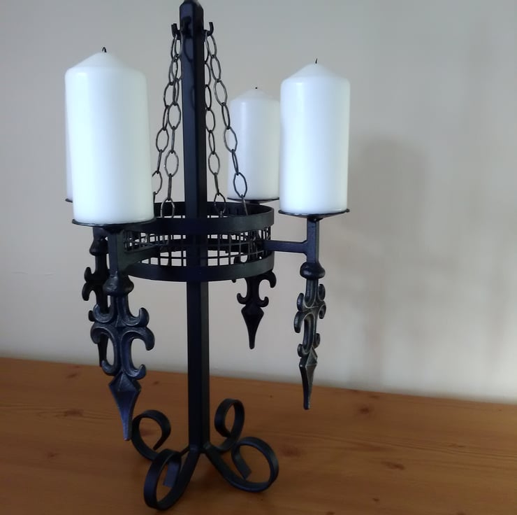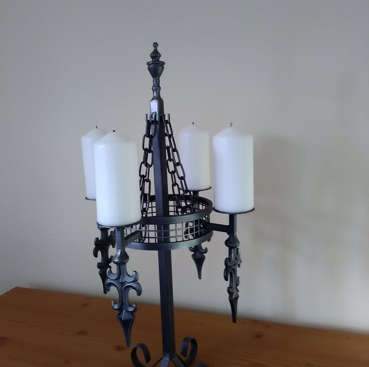 This candelabra Is finished in a matt black Base Layer then blown over with silver For a more antique feel. It is fitted with 4 traditional Gothic chains which suspended the basket from the centre pole which is topped with a silver urn. The arms are fitted to the mesh in such a way they appear to hover.