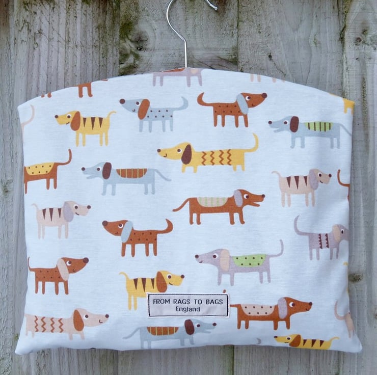A cotton clothes peg bag with a fun cartoon dog print in on a pale blue background. The clothes peg bag measures approximately 34cm wide and 28cm long and has a wooden hanger in the top. The capacity is 75-100 clothes pegs.