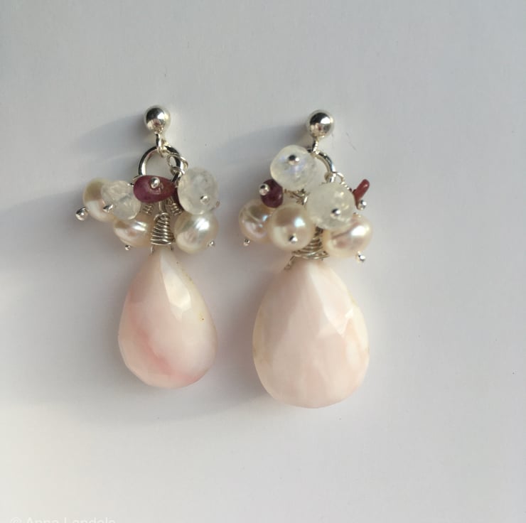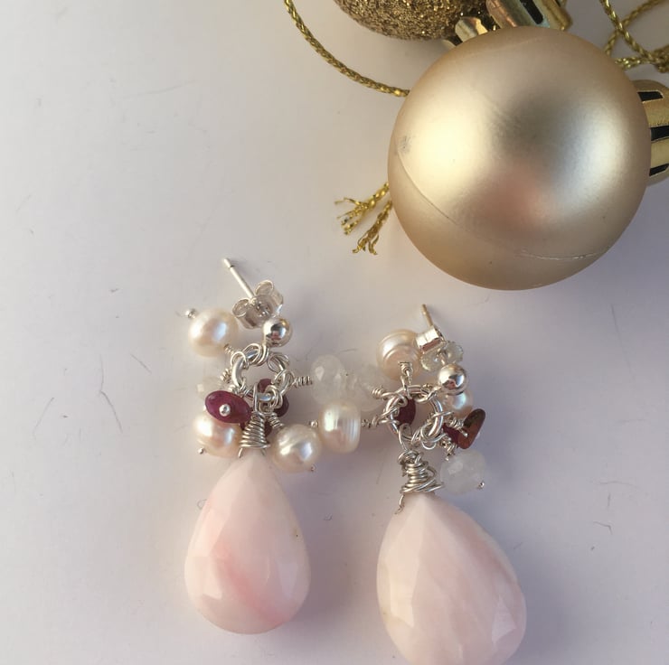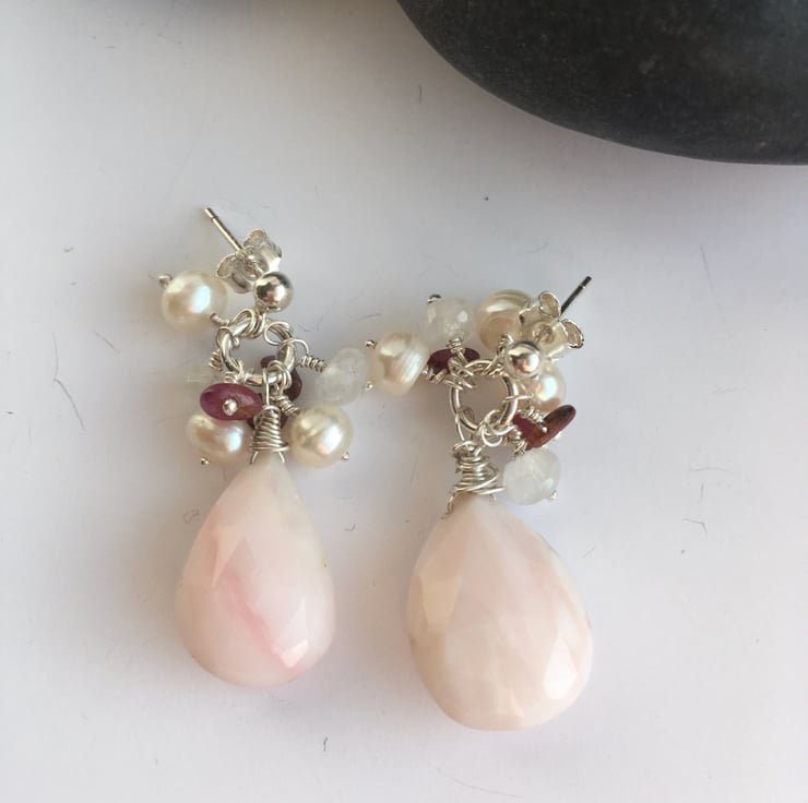These earrings feature pink opal drops, pearls, moonstone and rubies suspended from sterling silver ear studs with sterling silver metalwork throughout.