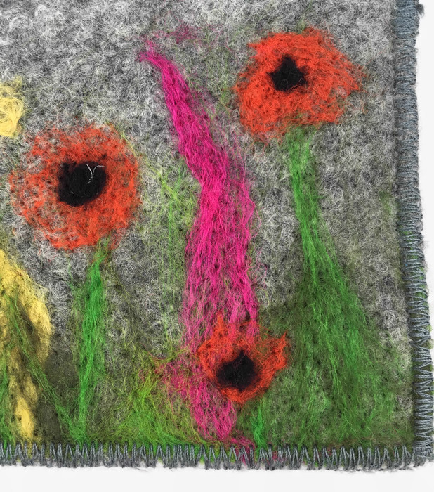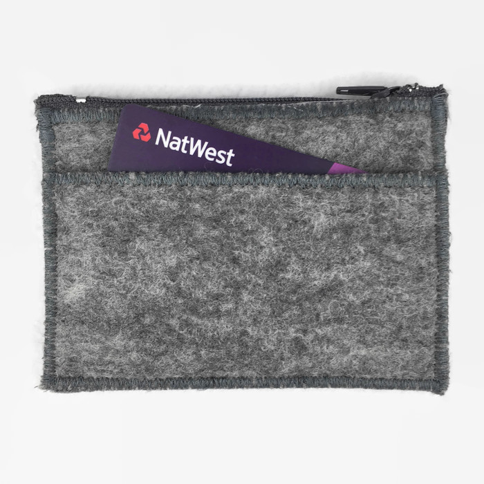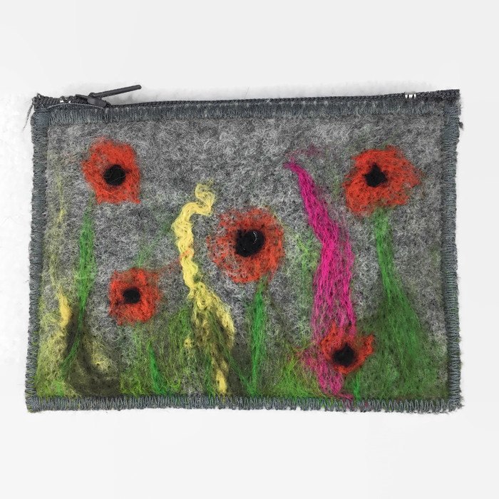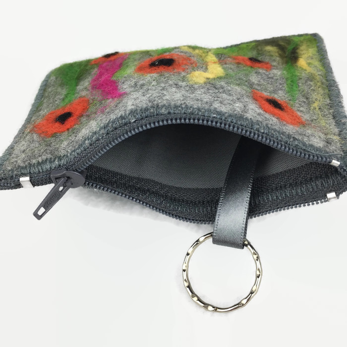 Made using a piece of grey hand made felt this purse has had a pretty poppy design needle felted to the front using various wool fibres. The purse has been made with an external pocket for cards or receipts and an integral keyring attached to the inside using a length of grey ribbon. The keyring can be tucked inside the purse or used externally to it with the purse still zipped closed. The purse is lined with grey poly cotton fabric and has a grey zip closure. It has been sewn together using a zig zag finishing stitch around the edges.