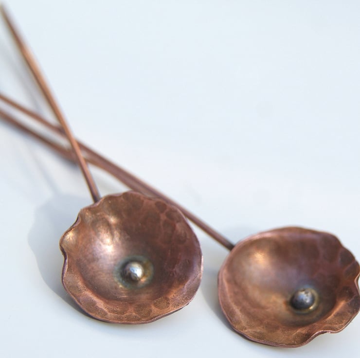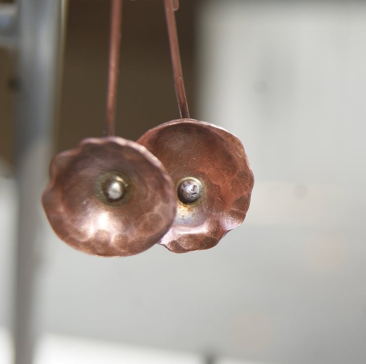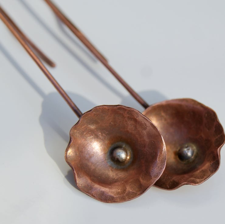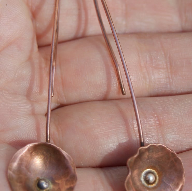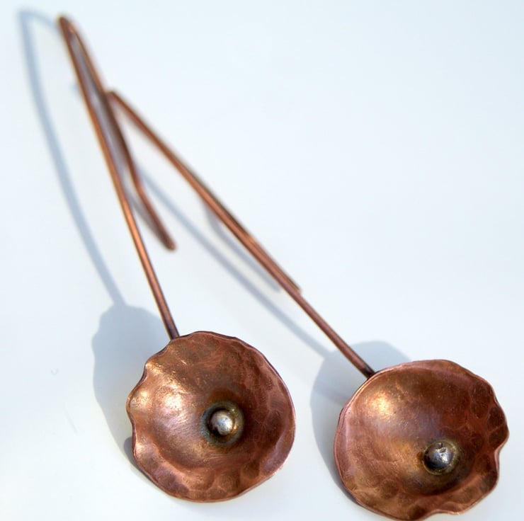Earrings feature beautiful copper flowers dangling from long hook ear wires.