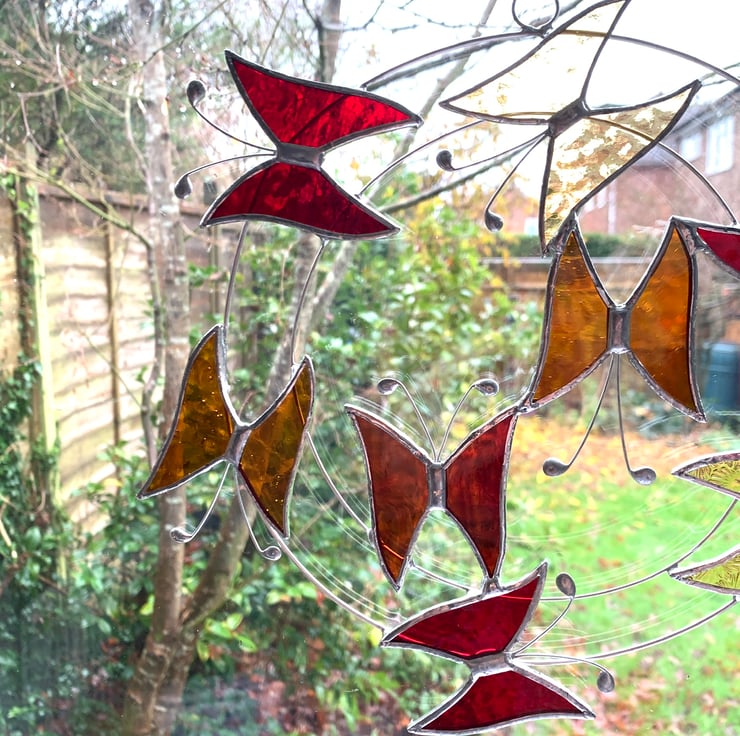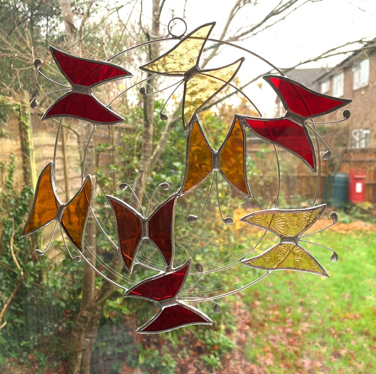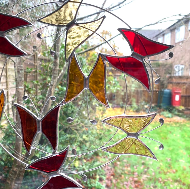 This suncatcher is a large butterfly circle made up of 8 small butterflies made from different types of red and amber stained glass.