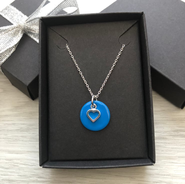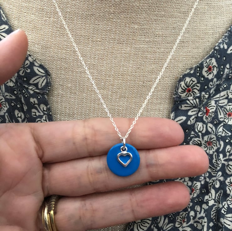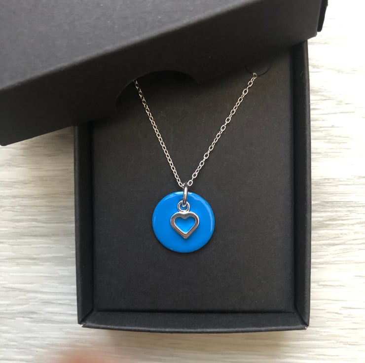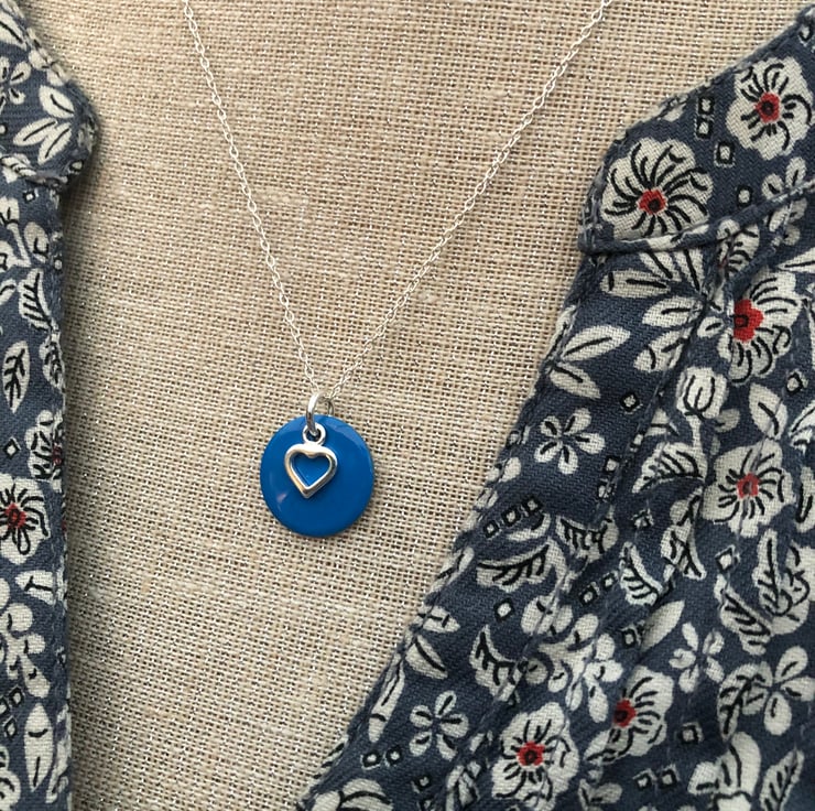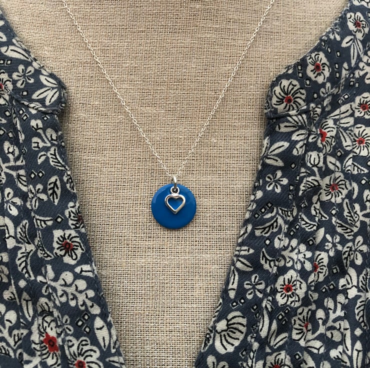 15mm stainless steel disc has been hand enamelled using the cold enamel technique. A 7mm sterling silver open heart charm hangs in front. Attached to a sterling silver chain with a sterling silver jump ring.