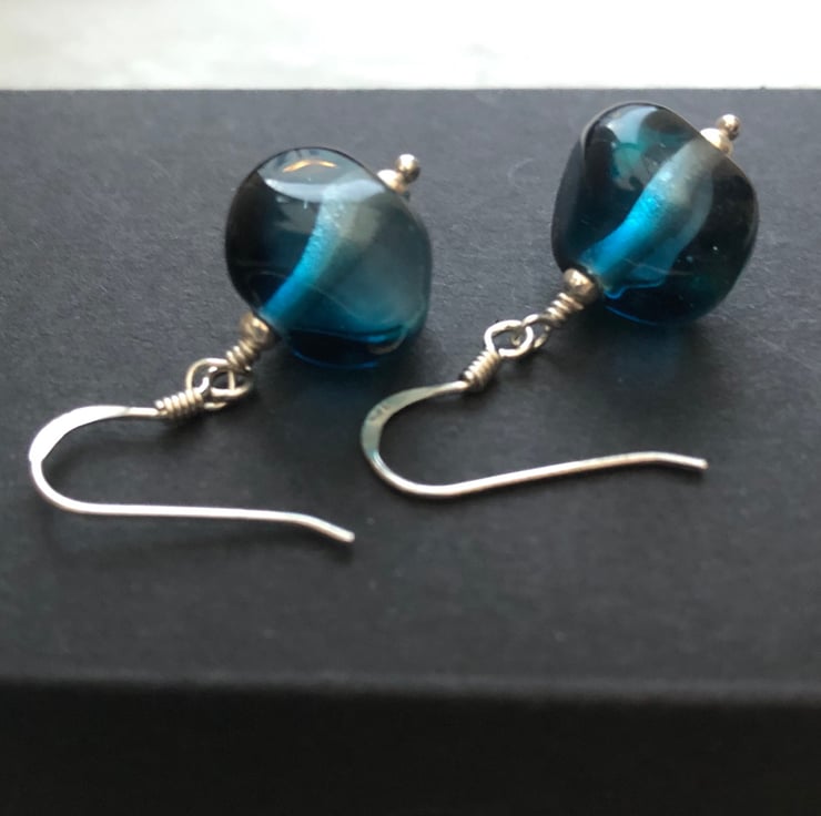 Stunning shiny blue ombré glass beads which measures approximately 13mm have been simply hand wired with sterling silver beads and a sterling silver headpin. They hang from sterling silver fish hook earrings.