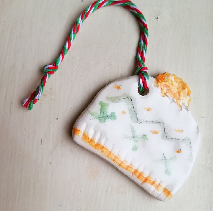 Hand made knitted hat ornament for the tree . Handpainted with fairisle and strung with tri colour twine .