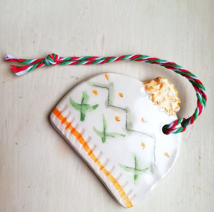 Hand cut from a slab of white clay. Once dry it was bisque fired then hand painted in underglaze prior to clear glazing in lead free glaze before the final firing .