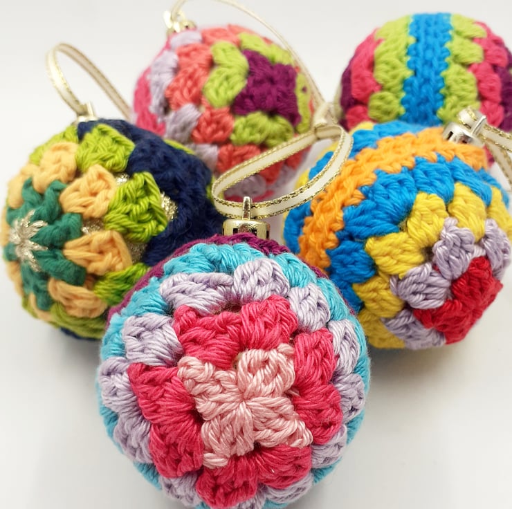 These festive decorations have been crocheted in cotton around a gold or sparkly plastic bauble. They measure approximately 5 cm in diameter and have a narrow gold ribbon for a hanging loop.