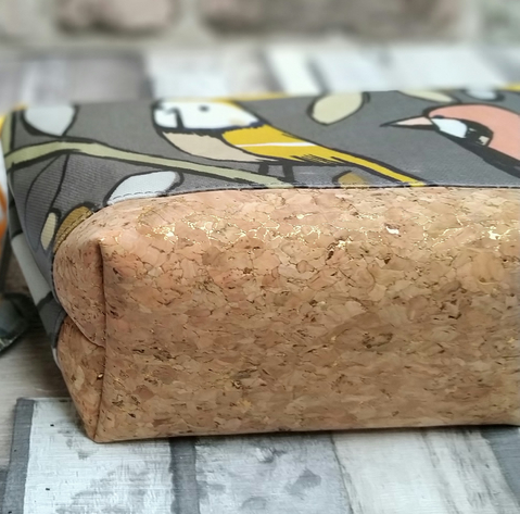 The base of the bag is made from a soft and water resistant cork fabric with subtle gold flecks.
