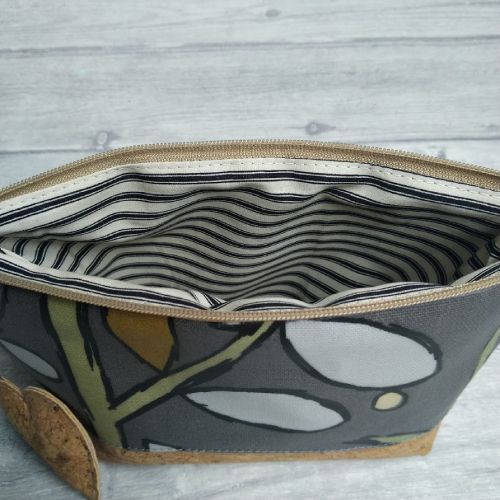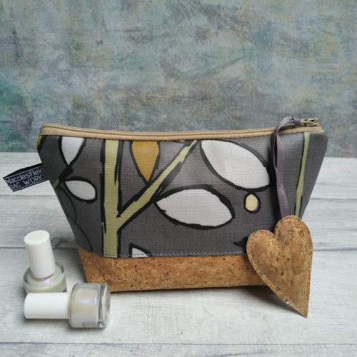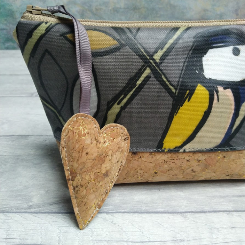 These unique make-up bags are handmade using a matt PVC coated cotton (oilcloth) with a quirky little bird design and lined with a black and cream striped cotton lining.