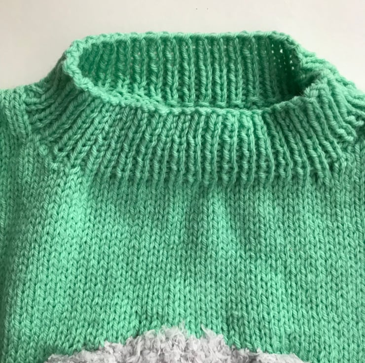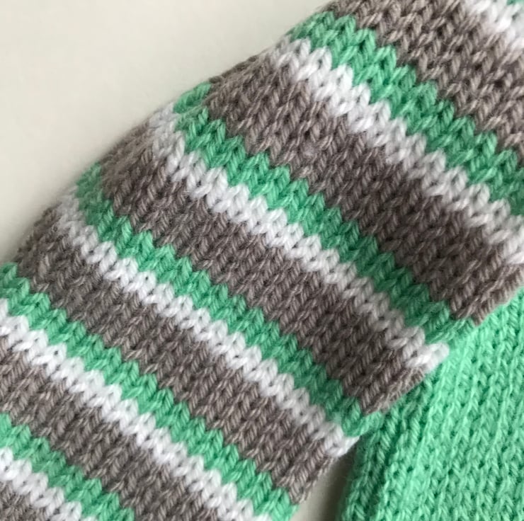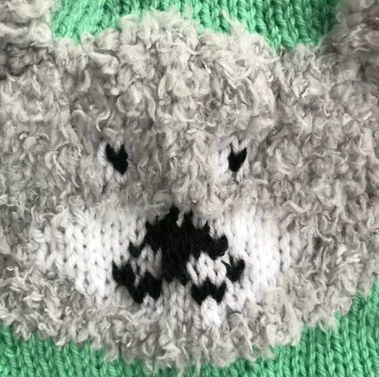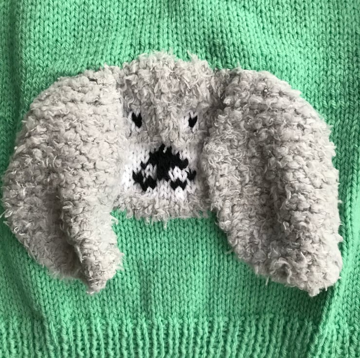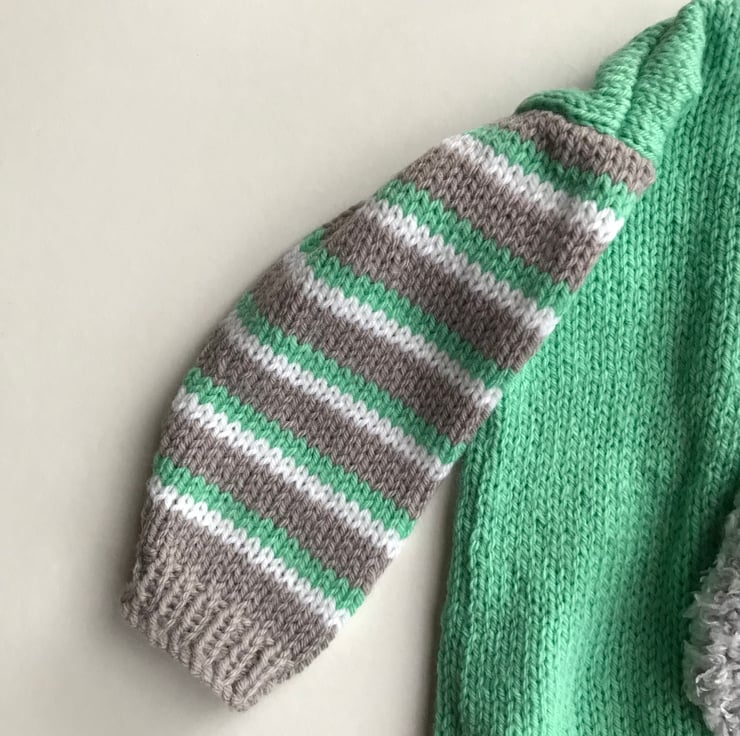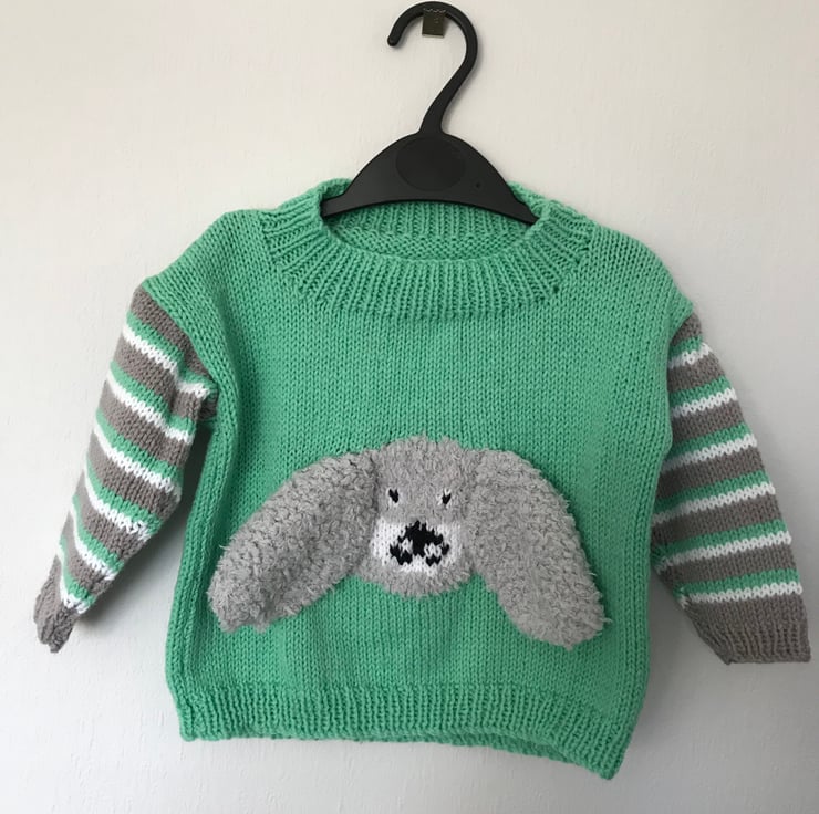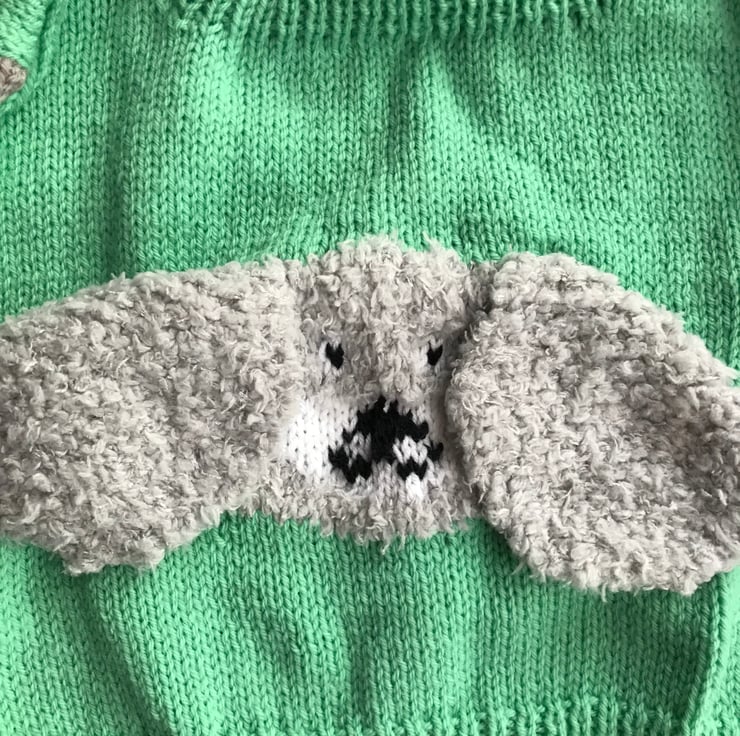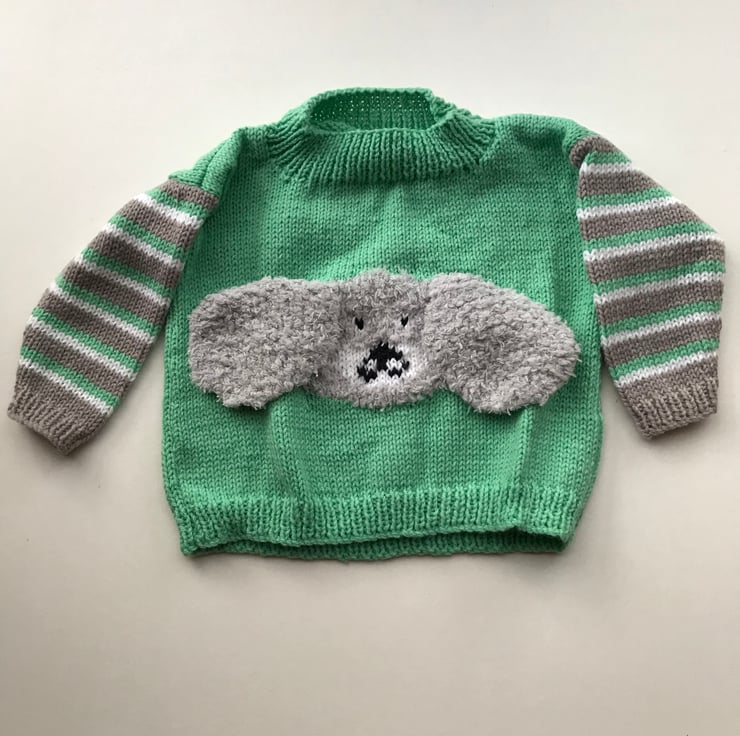 This handmade baby / toddler jumper is knitted in a soft baby yarn. It has a dog face on the front with floppy ears worked in a fluffy grey yarn. It has a ribbed neckline which stretches enough to make dressing easy. The sleeves are striped in green, grey and white.