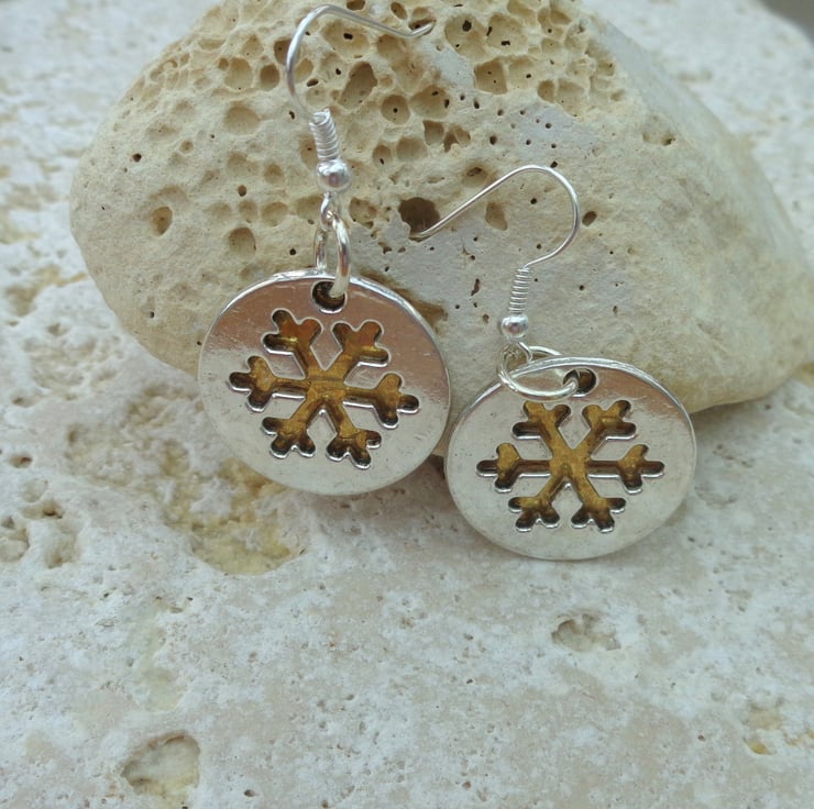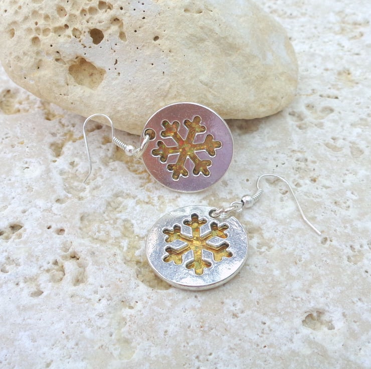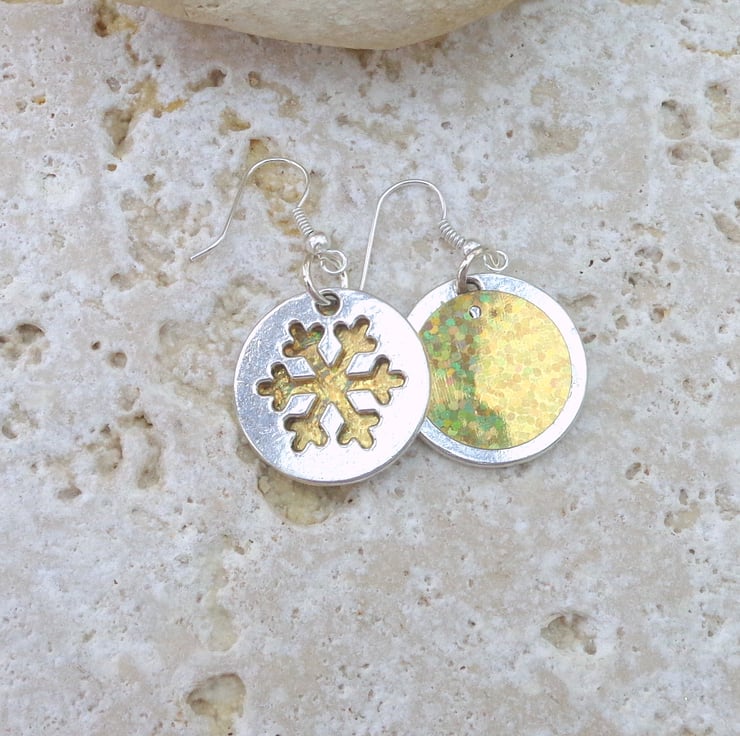 Simply festive, these are silver base metal disc earrings with a snowflake cut-out. The discs are backed with a light-catching golden hologram patterned circle, so from the front the snowflakes are gold-coloured.