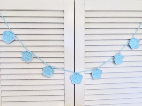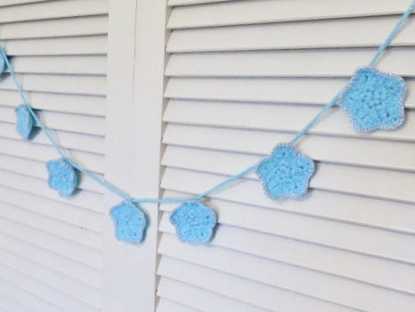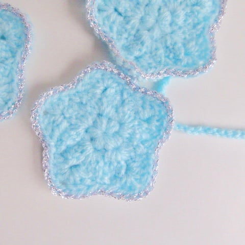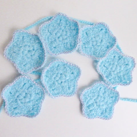 It includes seven star motifs complete with a silver edging. They are threaded onto a blue, crocheted string so that they can be adjusted. You can slide them quite easily. There are loops at each end for hanging.