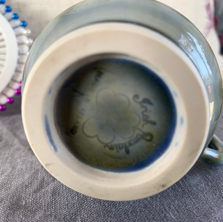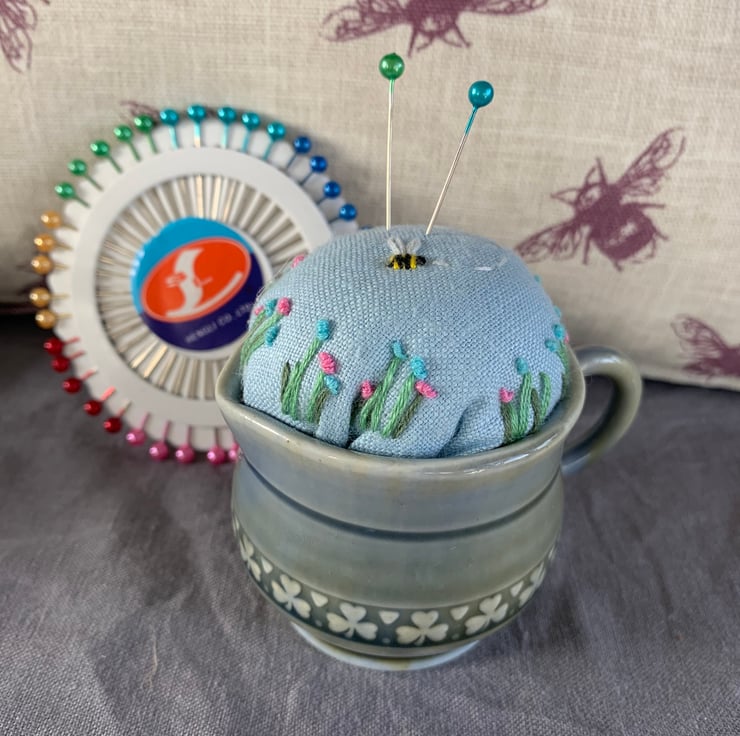 A little vintage Irish jug has a new life as a pin cushion. The cushion is blue linen, hand embroidered with flowers and a tiny bee.