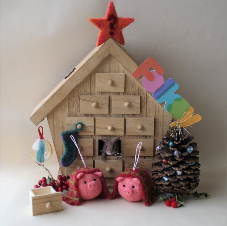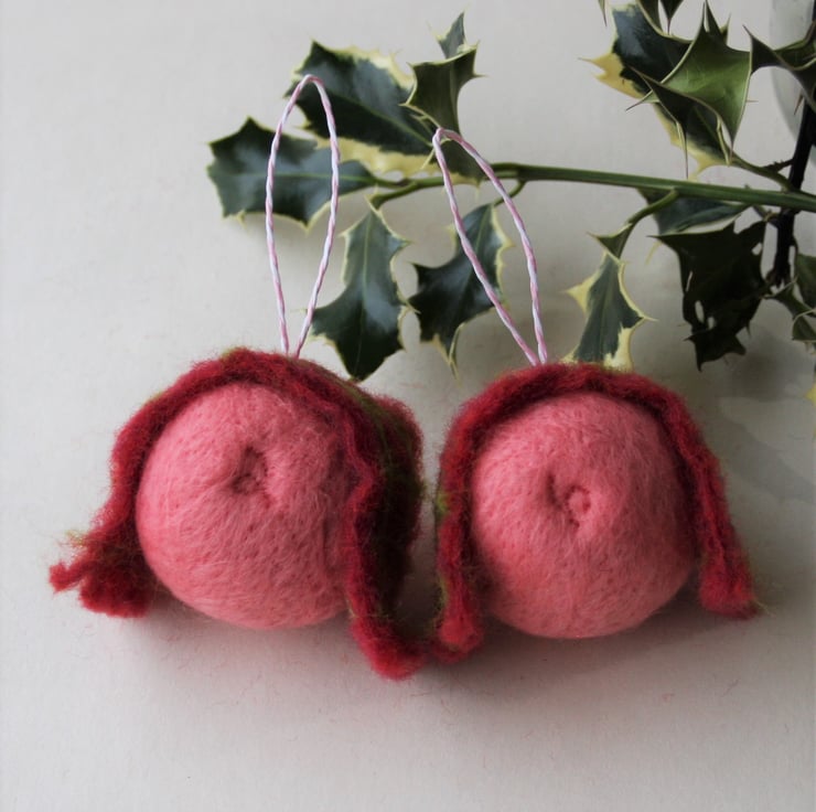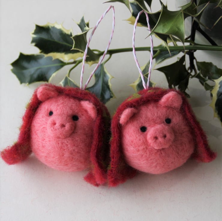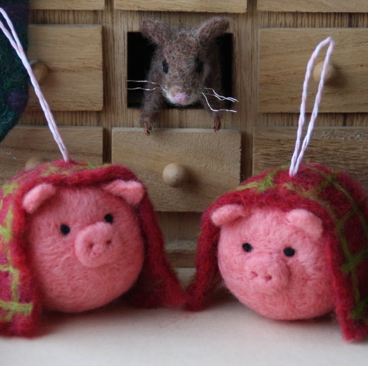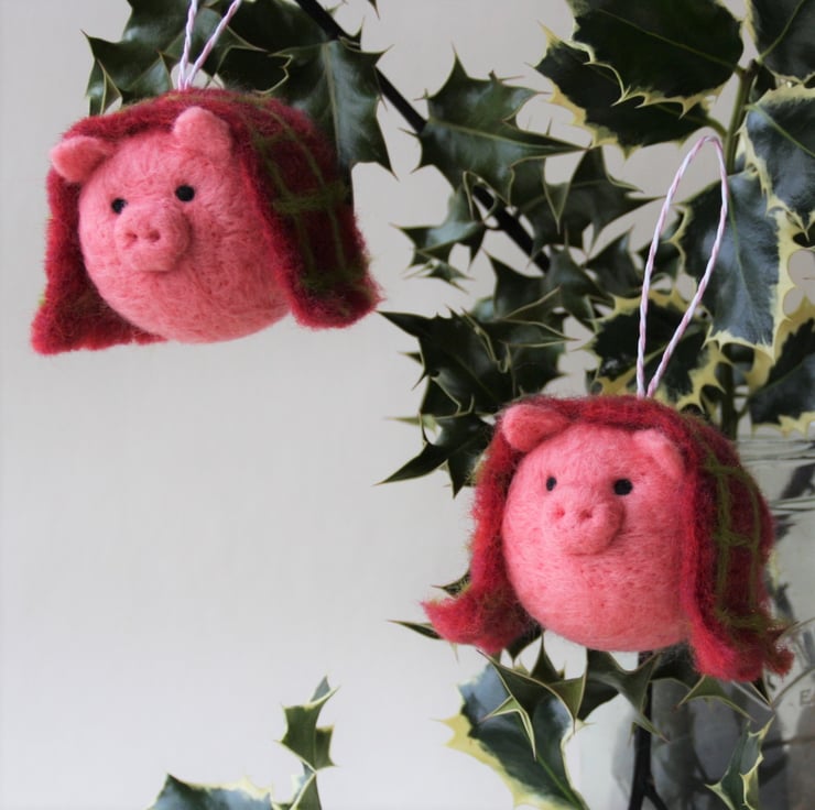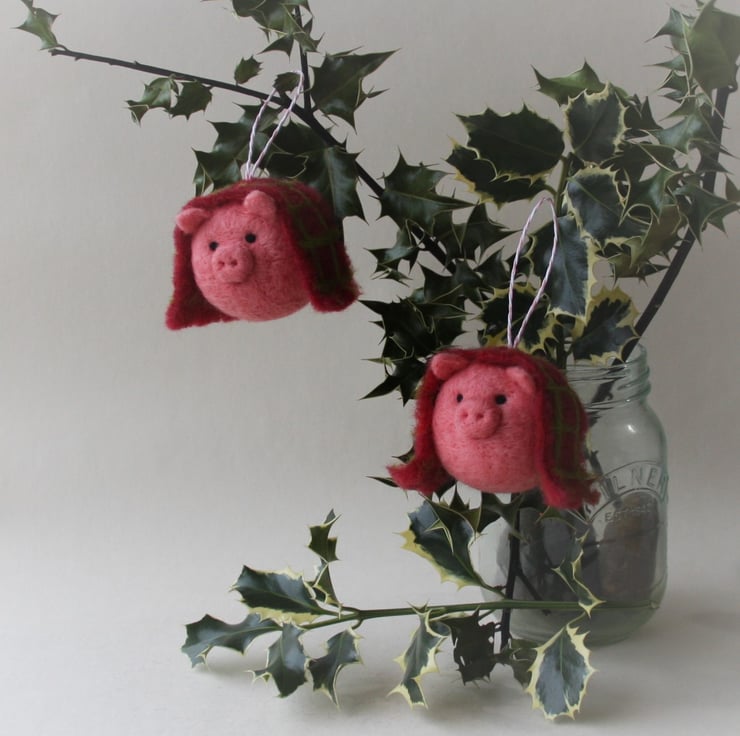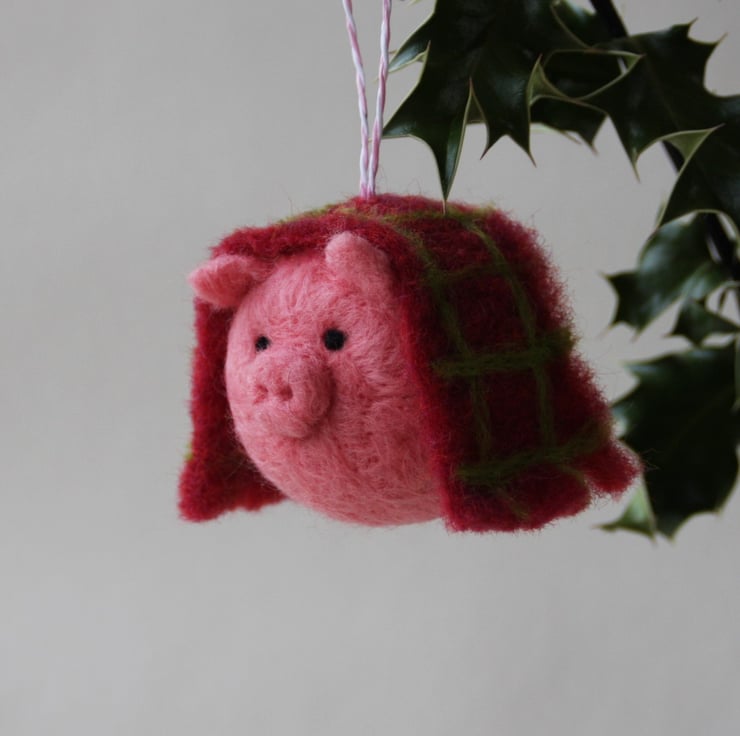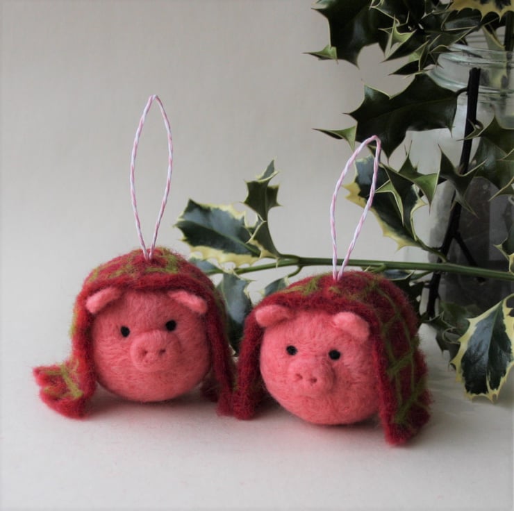 Handmade, needle felted pig tree decoration, draped in its own hand felted check blanket. Each bauble measures approximately 5cm diameter and has a striped paper string loop for hanging. As these ornaments are individually handmade, colours and design may vary slightly.