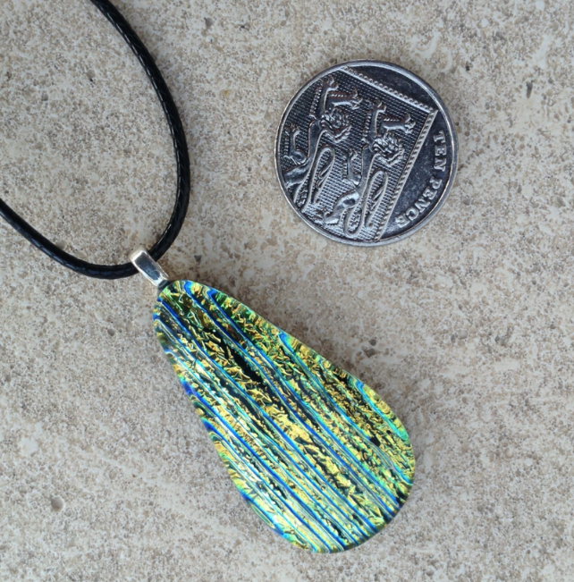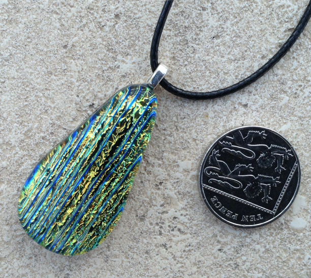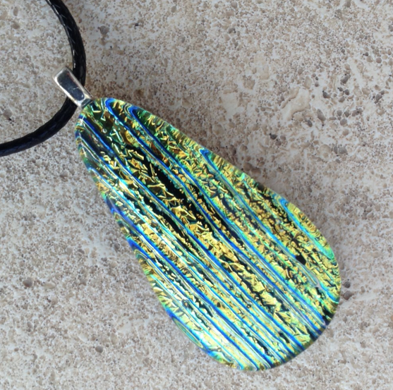 This glass pendant has been handmade in my small craft studio from sparkly dichroic glass, which gives it a wonderful shimmer when held to the light. It is teardrop shaped and makes a real statement piece at 4.25cm long (excluding the bail) x 2.5cm wide (max). The predominant colour is a bright yellow, threaded with narrow vertical lines of blue and turquoise and shot through with black. Only one pendant of this design is available, making it totally unique. The pendant is fitted with a silver-plated bail and presented on a black cord with a lobster clasp, which is adjustable between 44 - 48cm. Presented in a black organza gift bag.