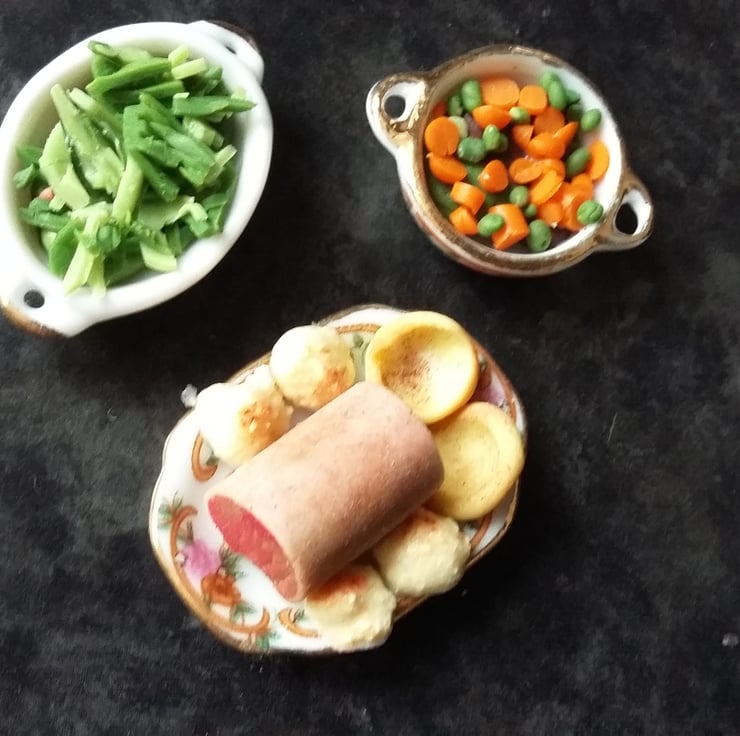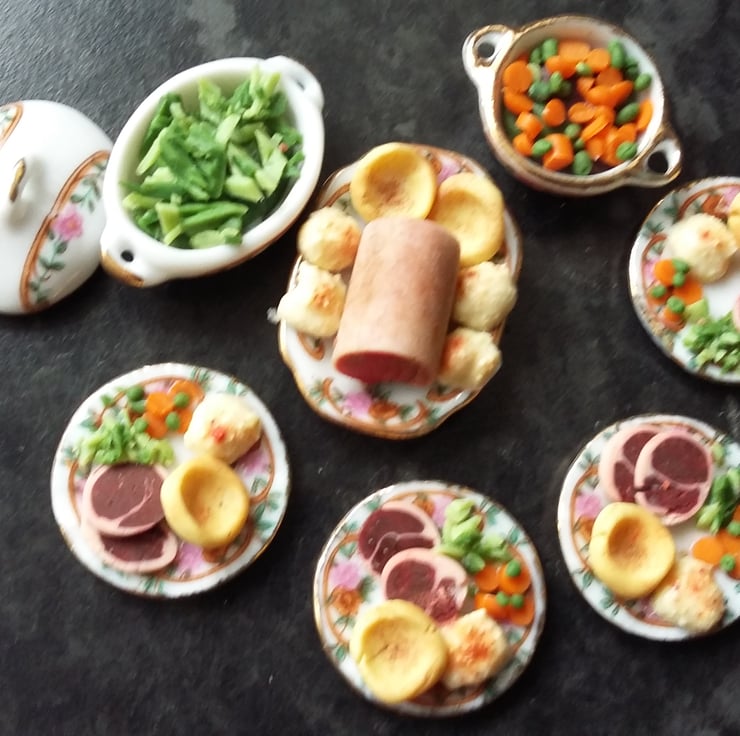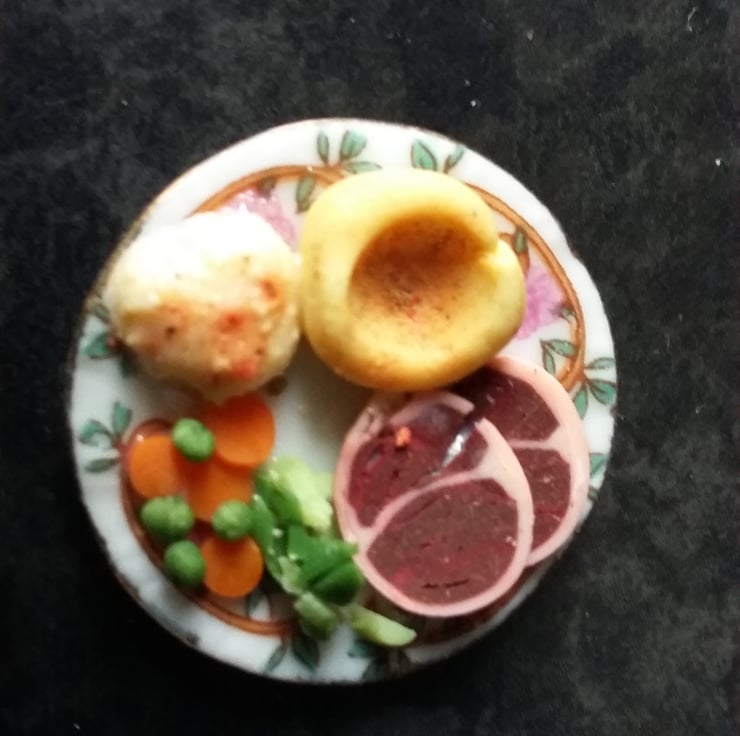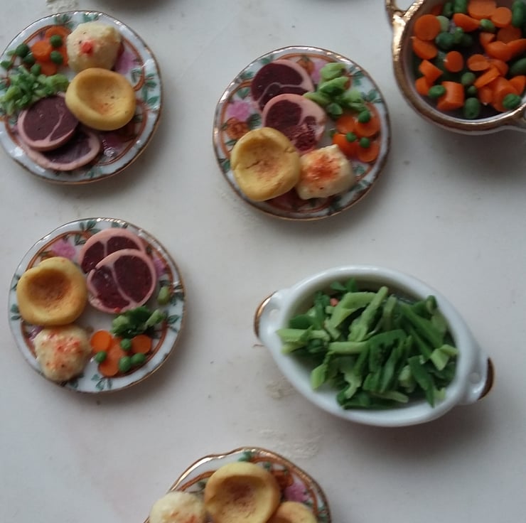A 1.12TH DINNER SETTING FOR FOUR ON CHINA PLATES. EACH PLATE HAS ROAST BEEF, YORKSHIRE PUDDING ,POTATOES,CABBAGE,CARROTS AND PEAS.
