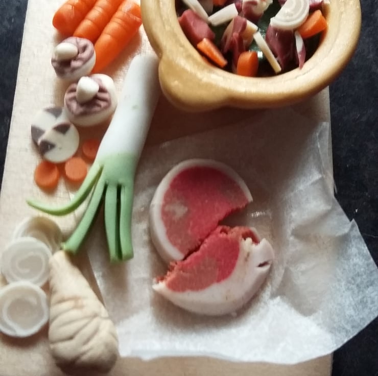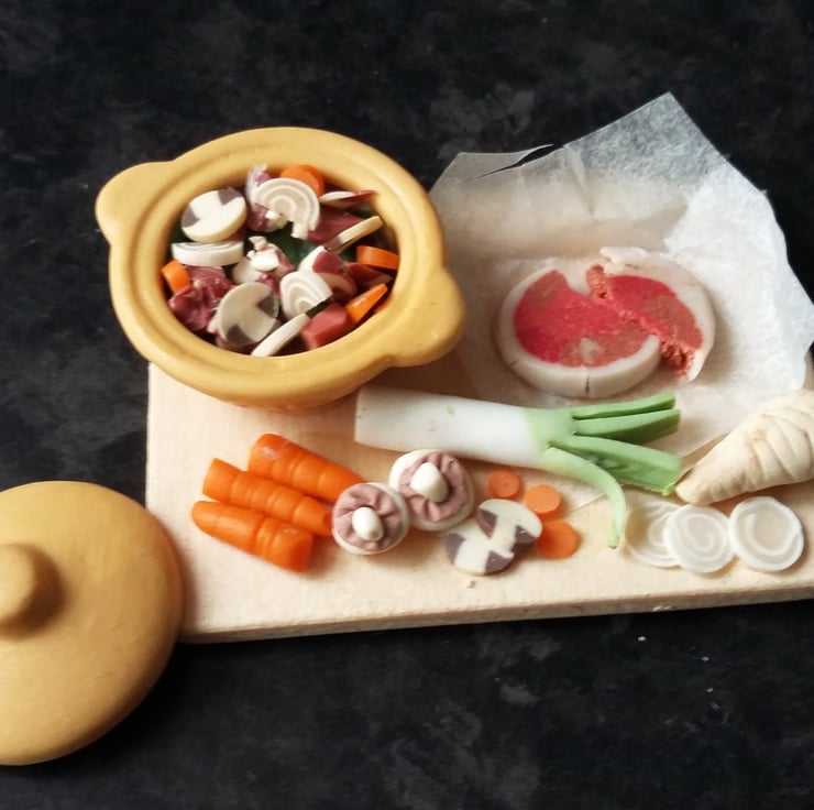 PRESENTED ON A WOODEN BOARD IS A SELECTION OF MEAT AND VEGETABLES WITH A CASSEROL DISH AND LID. EVERYTHING YOU NEED TO MAKE A CASSEROLE IN YOUR DOLLS HOUSE