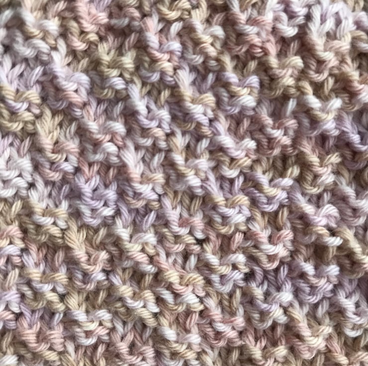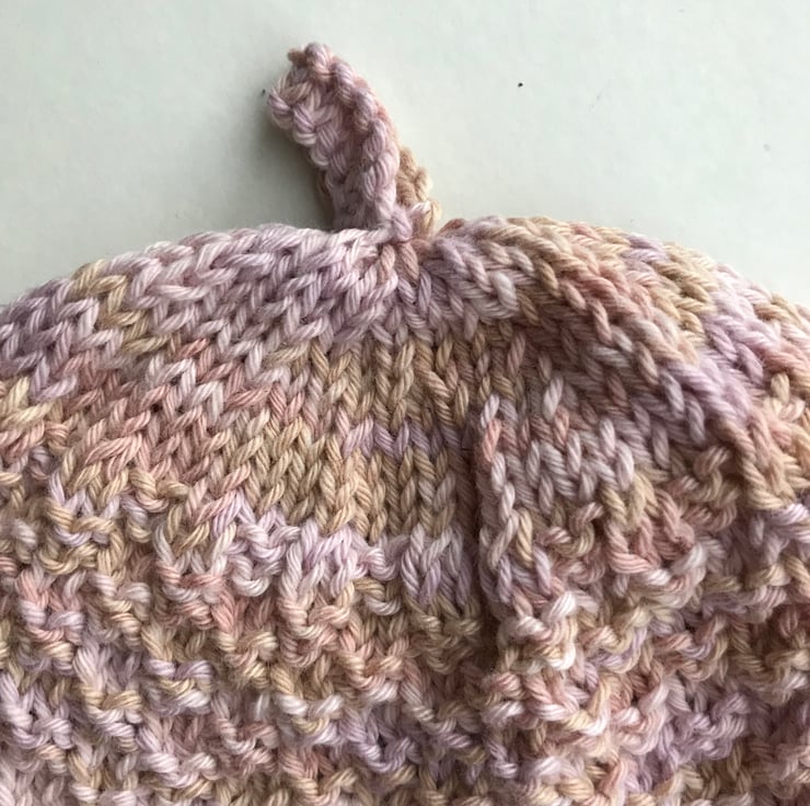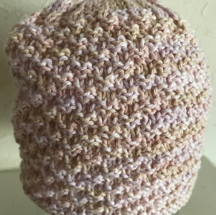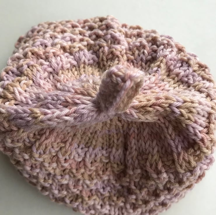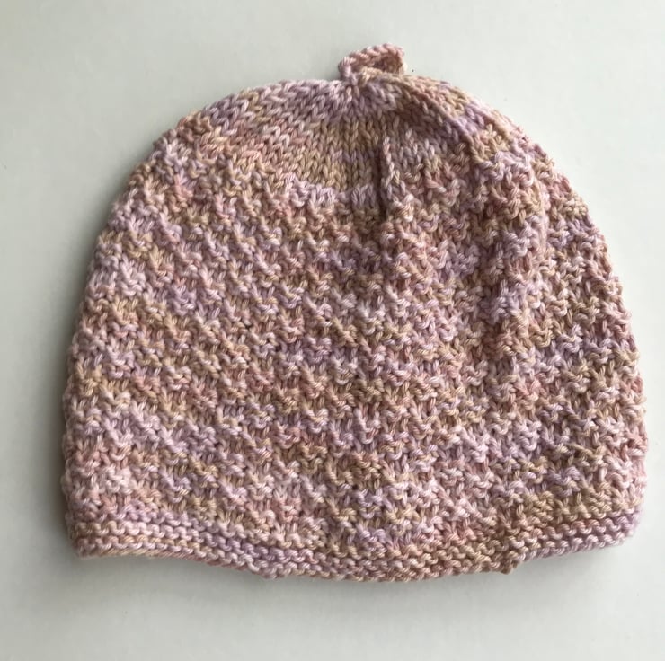 This handmade baby hat is knitted in a cotton blend yarn. The colours vary from pink to beige and the double moss stitch give the appearance of popcorn. The cotton in the yarn gives it great definition. It has a loop at the top for added interest.
