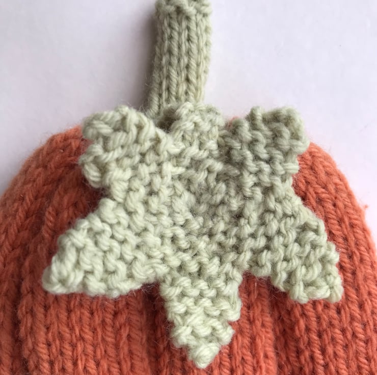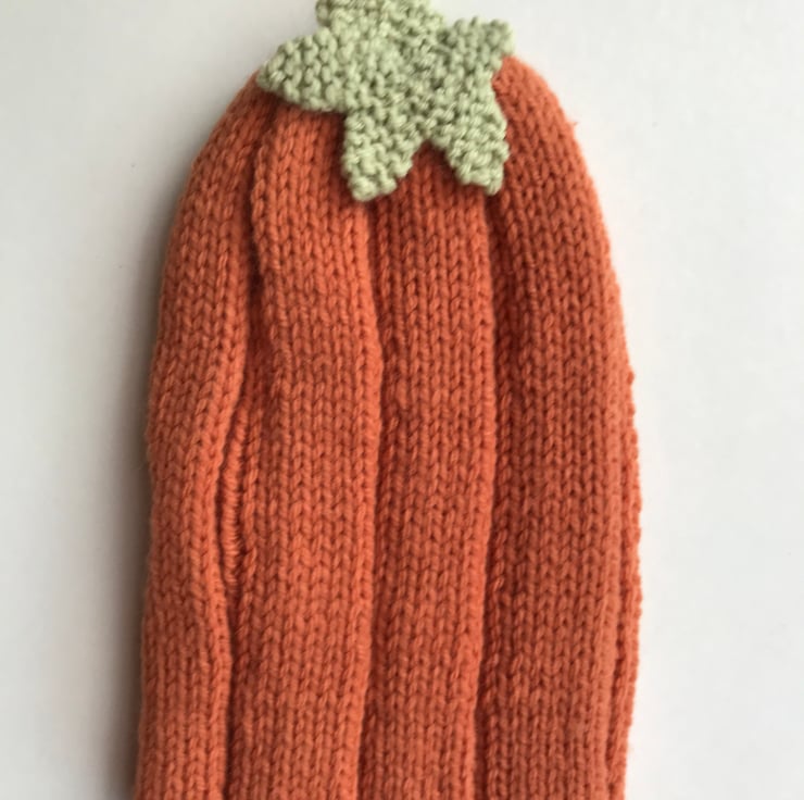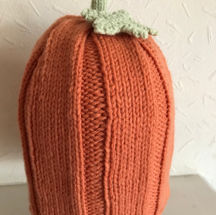 This cute hand knitted baby hat is worked in a soft baby yarn. It is worked in a broad rib pattern and at the top has a green stalk and leaf making it look like a pumpkin. Can be worn as a slouch hat or the brim could be turned back.