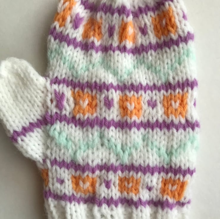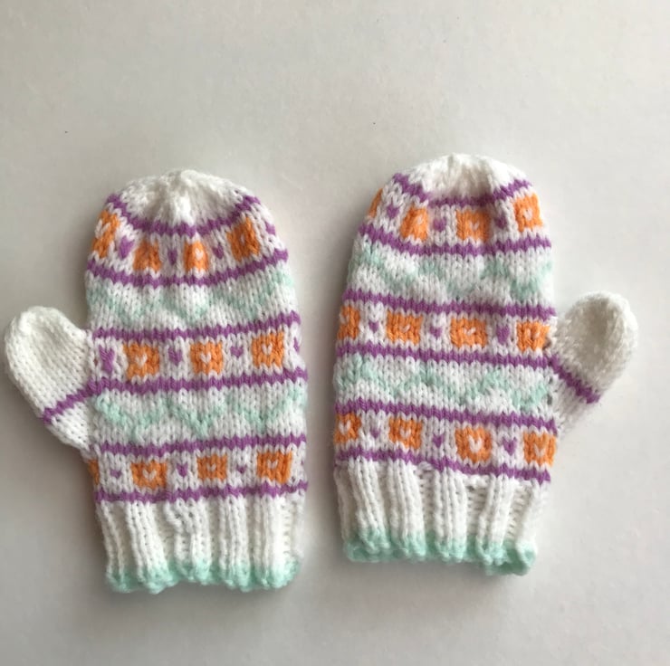 This pair of fair isle patterned baby mittens with thumbs are hand knitted in a soft baby yarn, They have an attractive zigzag pattern on them worked in three contrasting colours.