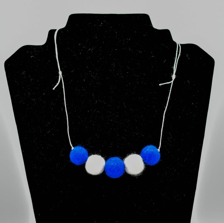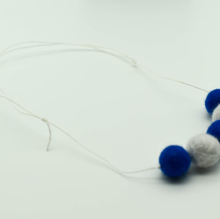This statement necklace has been created using five felted beads made from tones of grey, green and cream wool and strung on white 0.5mm hemp cord.