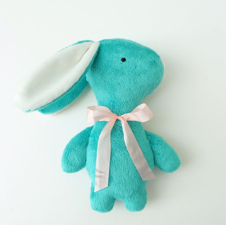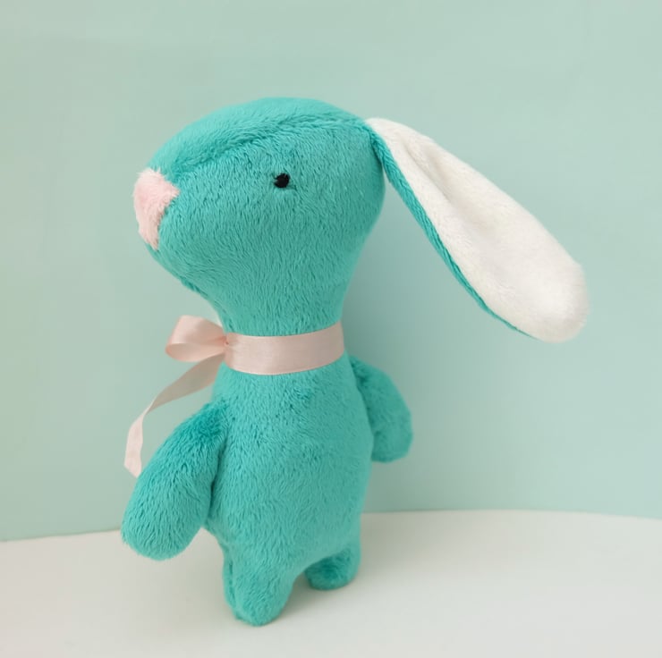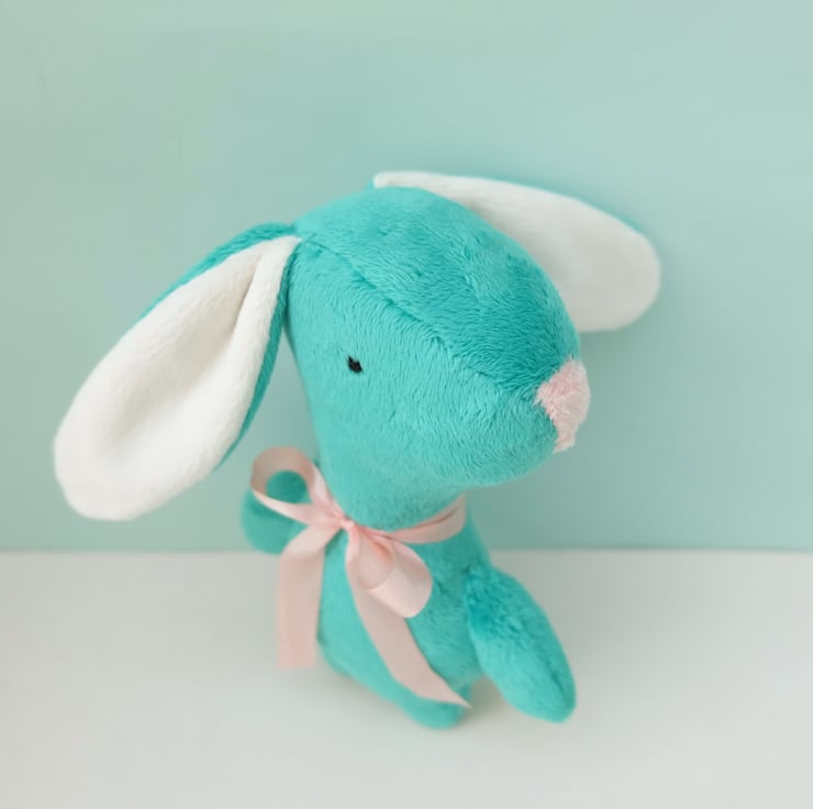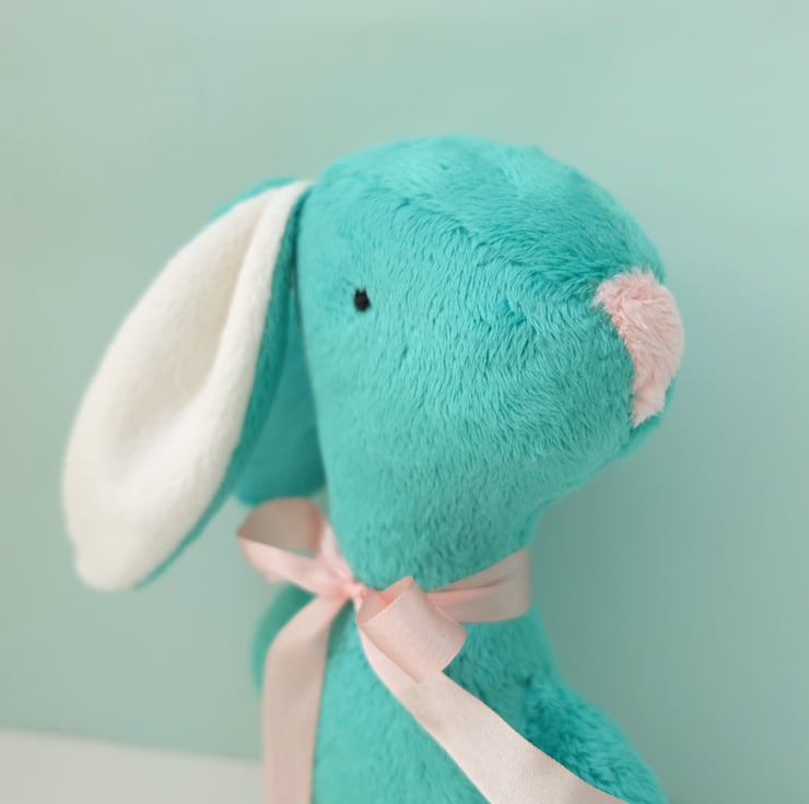 This sea green baby rabbit is made using the softest cuddle plush fabric and is so sweet and friendly! With floppy ears lined in ivory plush and a pale, vintage pink silk bow. I have sewn satin stitch little eyes using black stranded cotton thread and a nose using vintage pink cuddle plush.