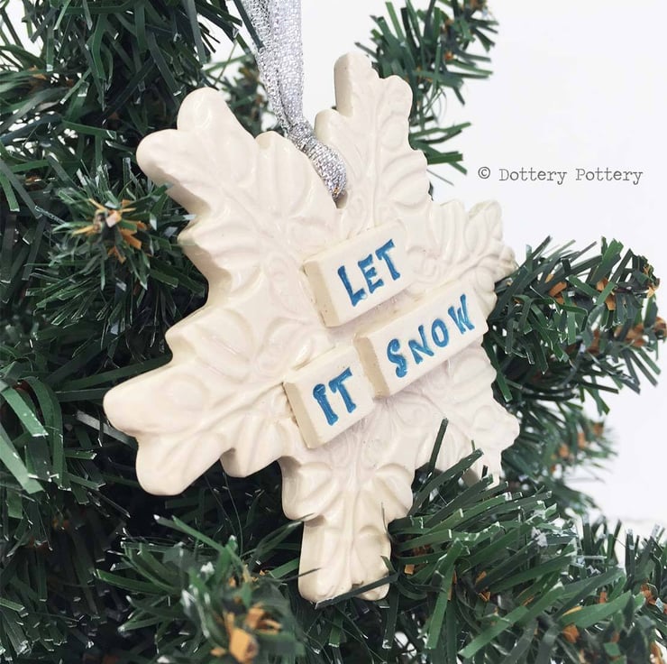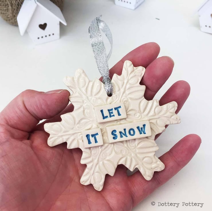This listing is for a really pretty, pottery snowflake Christmas decoration with the words Let It Snow. It's made from white earthenware clay, imprinted with pattern and finished with a clear, glossy glaze. It has been fired twice, once to the bisque stage and then a second firing for the glaze. It measures 9cm x 8cm x 5mm thick. It can also be hung outdoors.