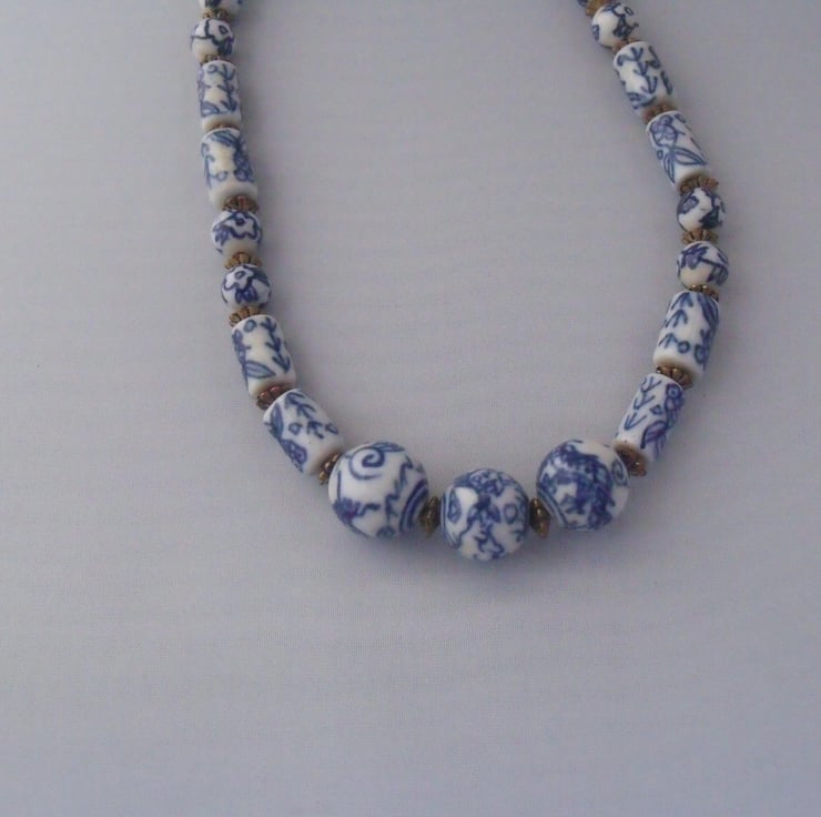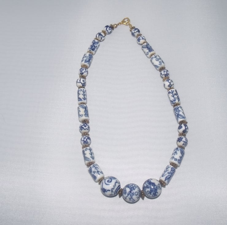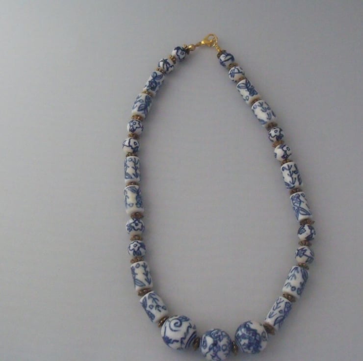 This is a necklace made from round and tubular blue and white ceramic beads. In between each bead is a gold coloured small disc and it is finished with a lobster clasp. It is approximately 15 inches long