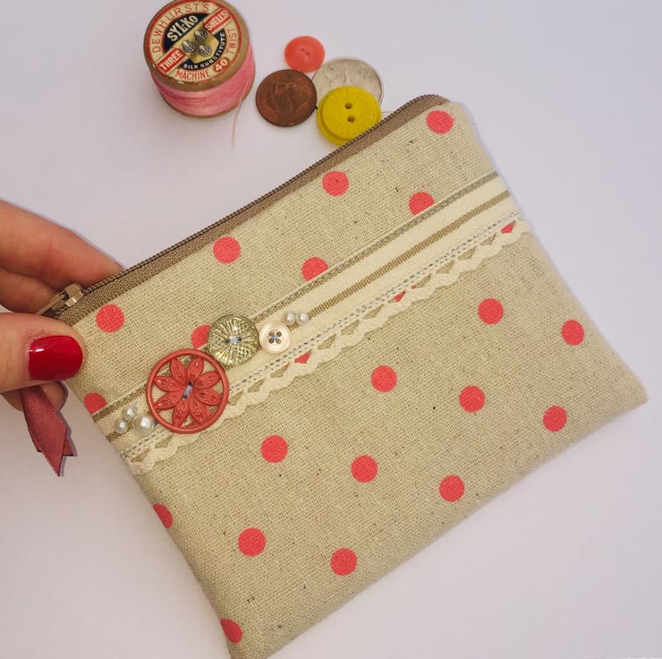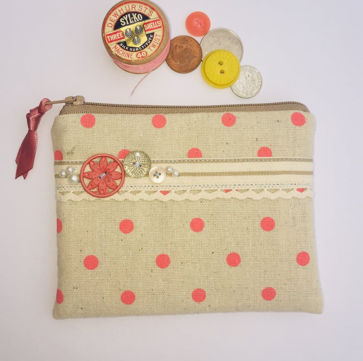 Handmade purse embellished with buttons, pearls, lace and ribbon. Perfect for your coins, notes and cards.