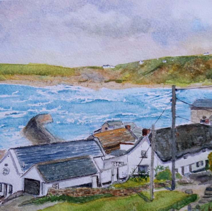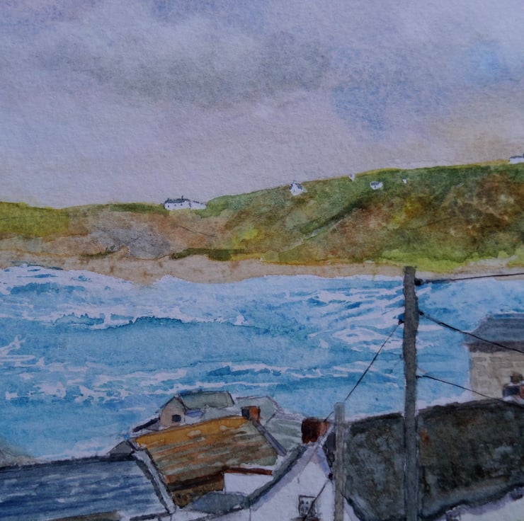 This is a small watercolour painting from my own photograph of Sennen Cove in West Cornwall. The view is taken from the thatched cottage at Sennen Heights on an overcast day. Sennen Cove is a beautiful and popular village with a magnificent beach, just a short hop from Lands End. Supplied unmounted and unframed for you to present/exhibit as you wish.