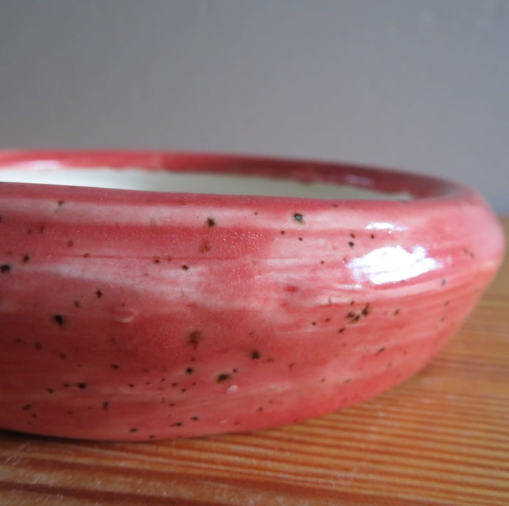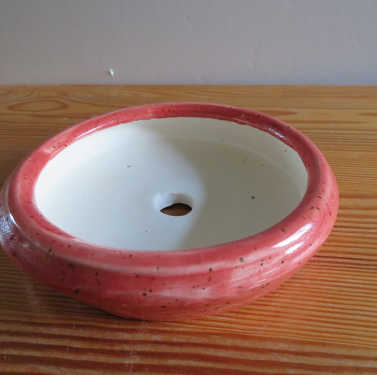 White ceramic bonsai pot lightly glazed with a deep rose coloured mottled glaze, lipped base and one central hole to assist with drainage. 3 small 2 mm diameter wire holes in the base to help retain bonsai roots