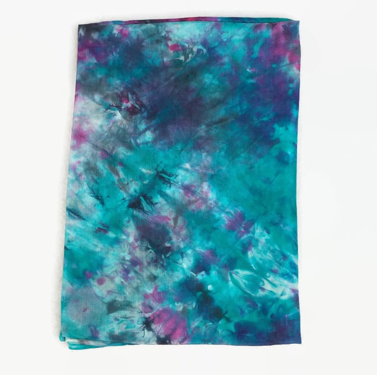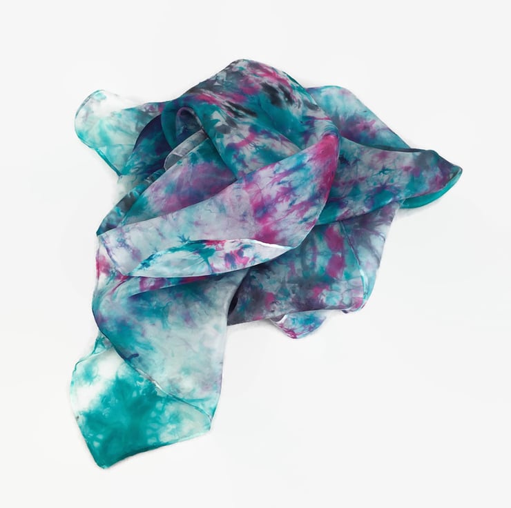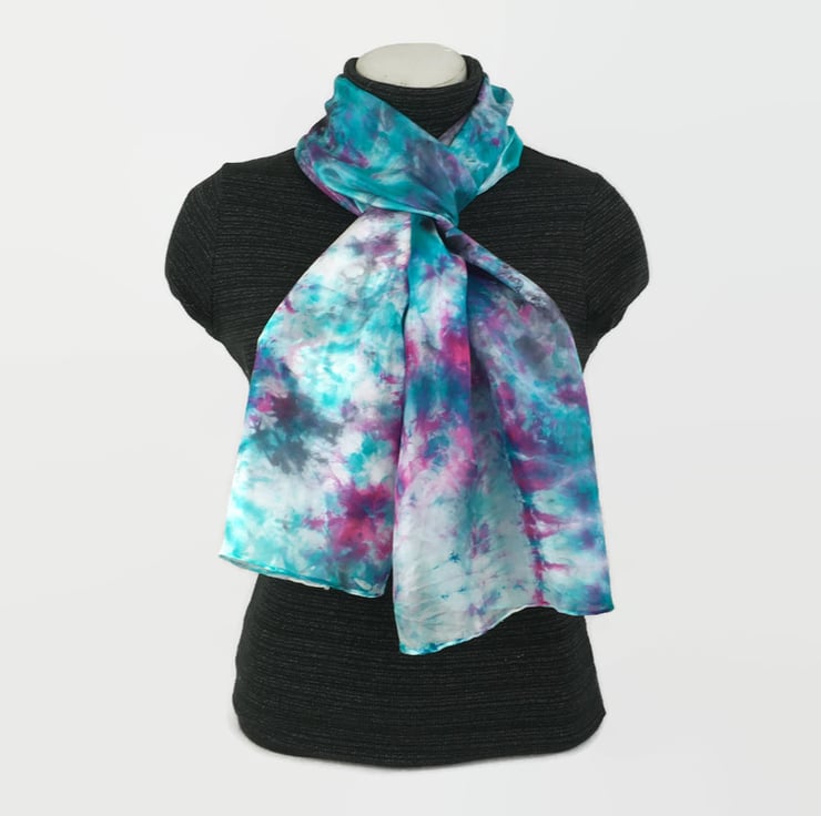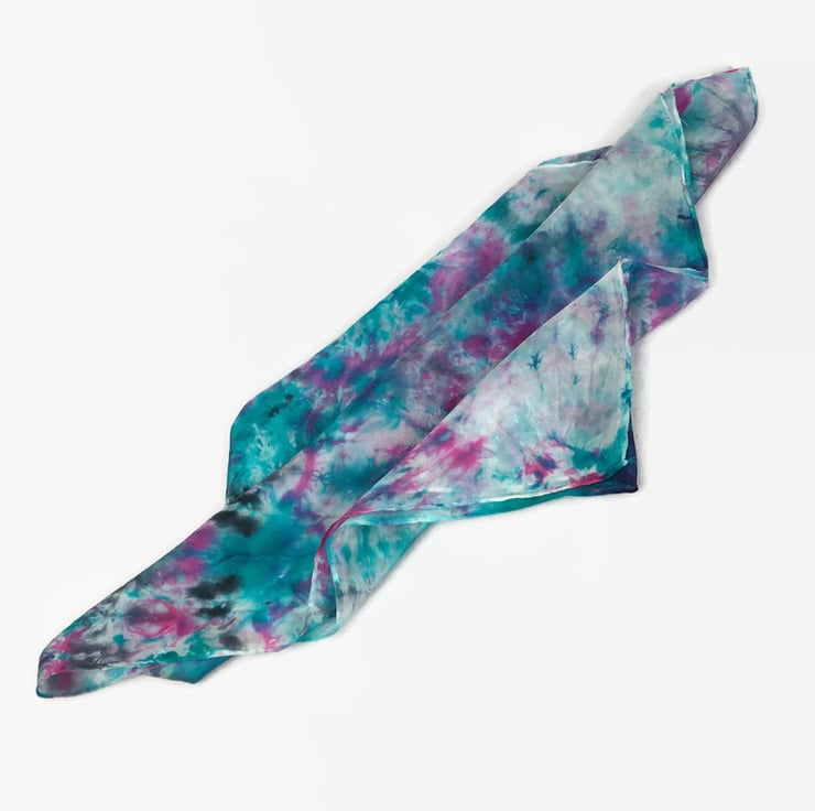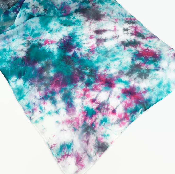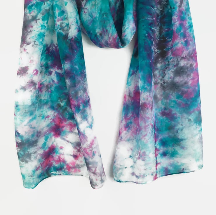 A hand dyed long silk scarf. Coloured dyes have been applied to this white silk scarf in a random fashion. Bright turquoise and pink colours have been used with the addition of small areas of black.