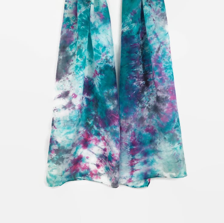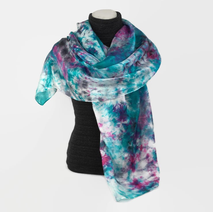 The resulting scarf measures approximately 170cm x 44 cm ( 67" x 17"). It drapes beautifully, has a lovely surface sheen and is long enough to wrap around the neck or tie in many ways. It is also large enough to be worn around the shoulders as a shawl or wrap. A fabulous addition to any outfit.