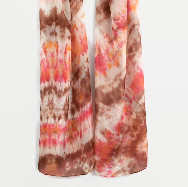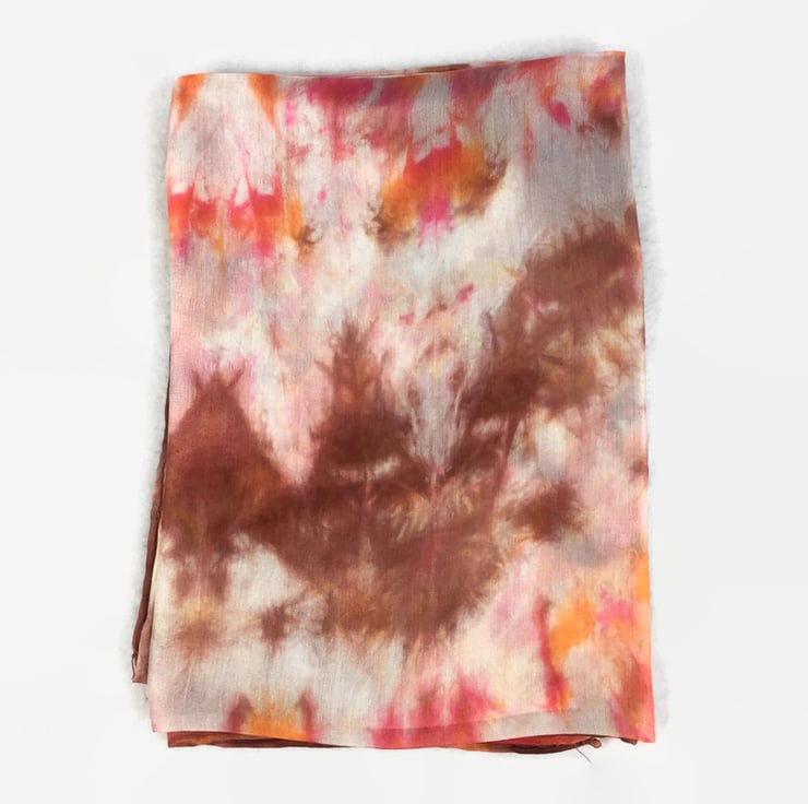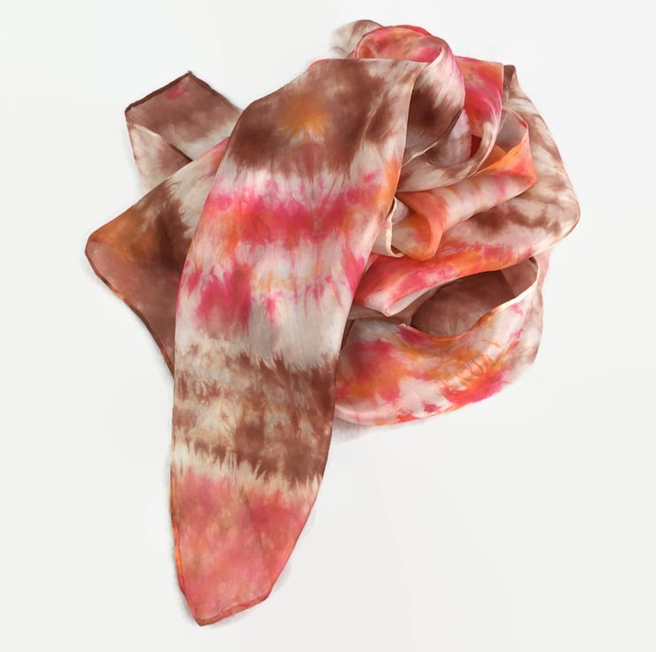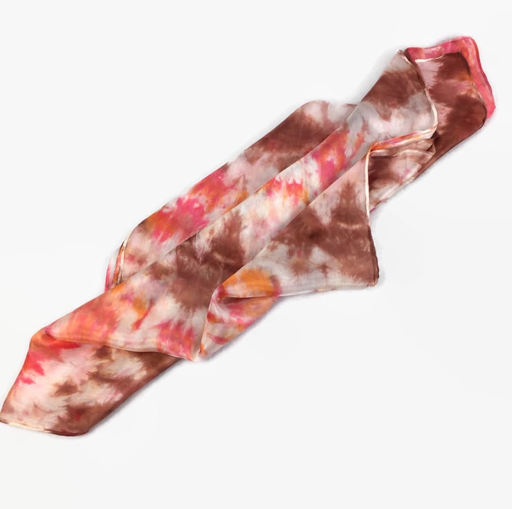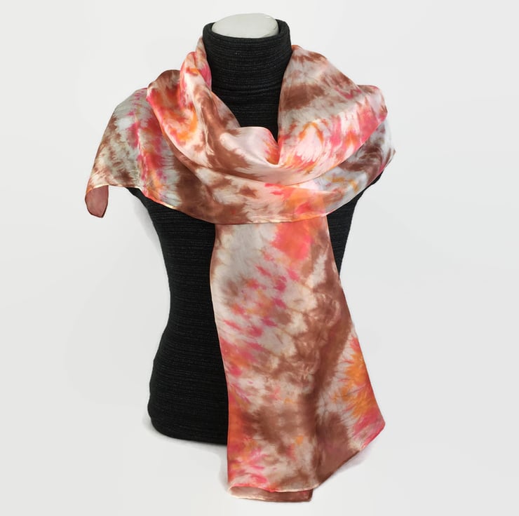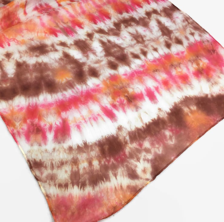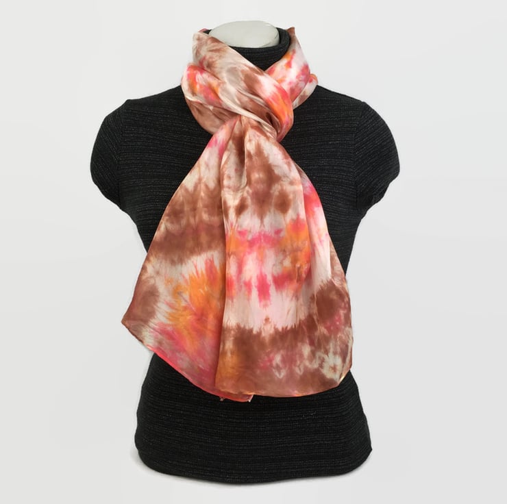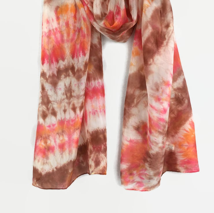 A floaty, lightweight silk scarf that has been hand dyed using brown, orange and red colours. The scarf has been folded and dyed in such a way that the colours appear in bands across the scarf.