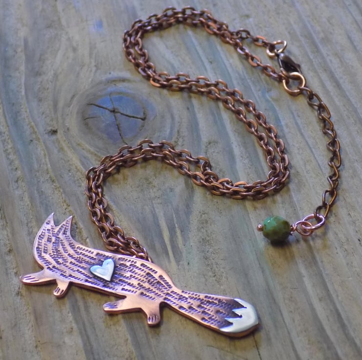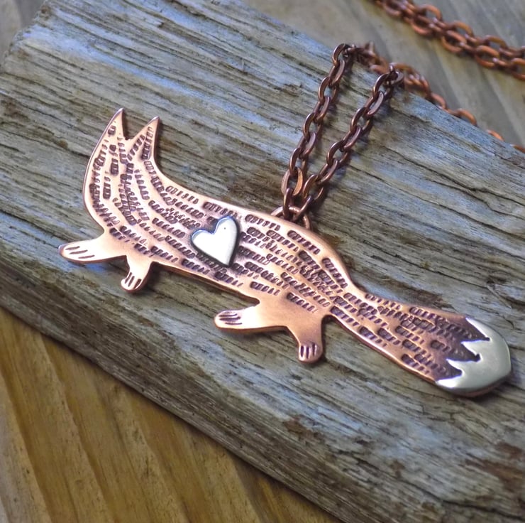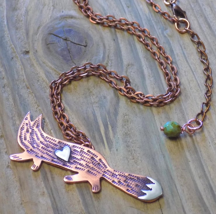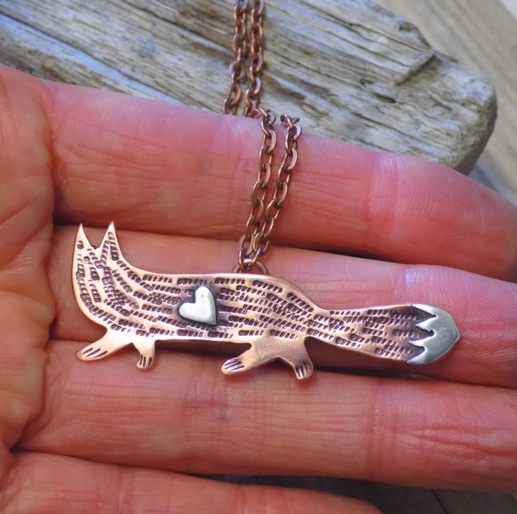 Designed and hand sawn from 1.2 mm thick copper sheet. Each textured stroke has been stamped onto the copper to create the foxes coat and a sterling silver heart has been soldered to the front plus the 'white' tip of the foxes tail. The whole pendant has been given an aged effect which picks out all the detail and texture creating a lovely contrast between the silver and copper. Attached to an aged copper trace chain adjustable from 17"-19".