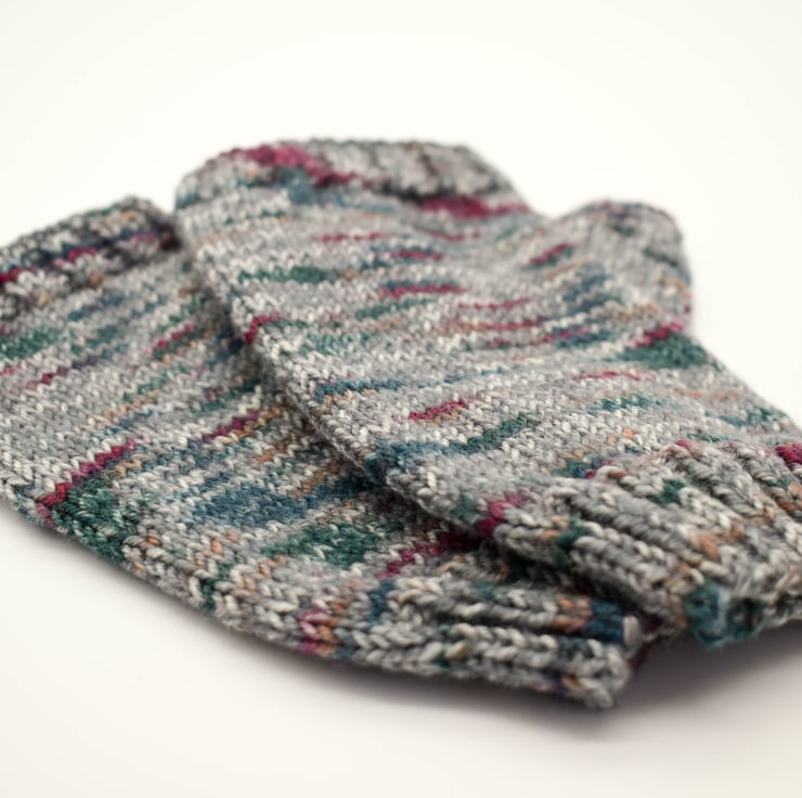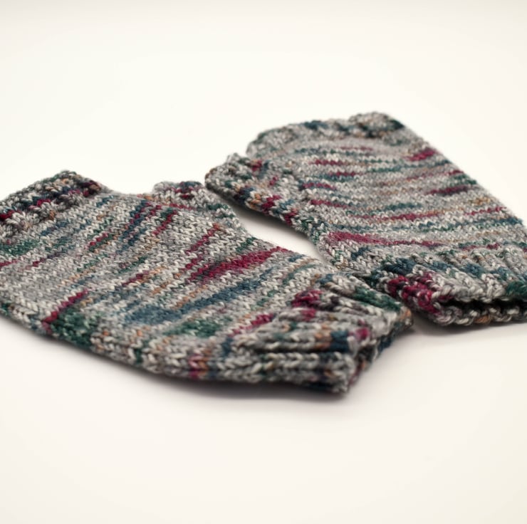 These hand knitted fingerless mittens are made from 100% merino wool. Great for keeping your hands and wrists warm while keeping you fingers free. This wool is predominantly grey with teal, ochre and burgundy flecks through it.