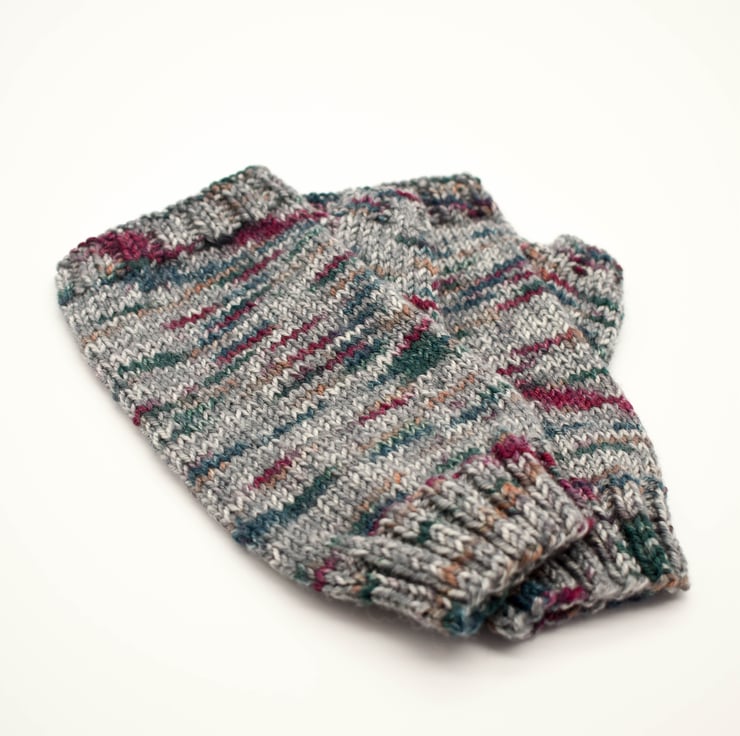 These hand knitted fingerless mittens are made from 100% merino wool. Great for keeping your hands and wrists warm while keeping you fingers free. This wool is predominantly grey with teal, ochre and burgundy flecks through it.