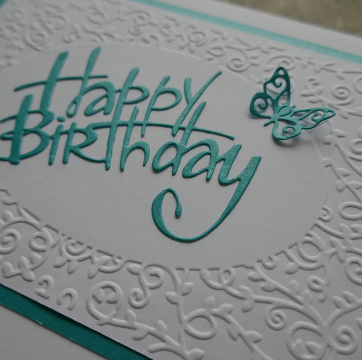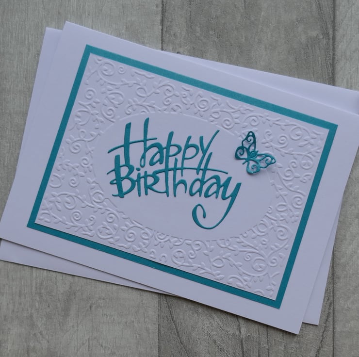 A panel of card has been embossed with a swirl frame and layered onto turquoise pearlescent card. A turquoise 'Happy Birthday' sentiment and small turquoise butterfly have been added to the centre of the card.
