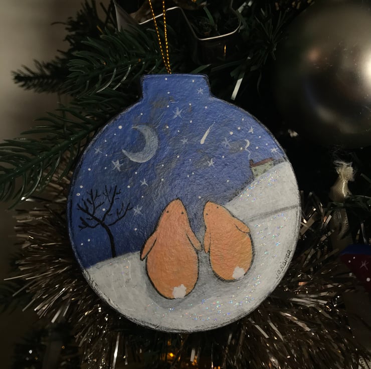 An original painting using acrylic paint and ink on a mache dangling flat bauble. Slightly sparklyfied.