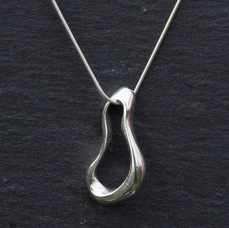 Necklace made using the lost wax casting method. The pendant measures 19mmw x 35mmh and hangs on an 18 inch snake chain.