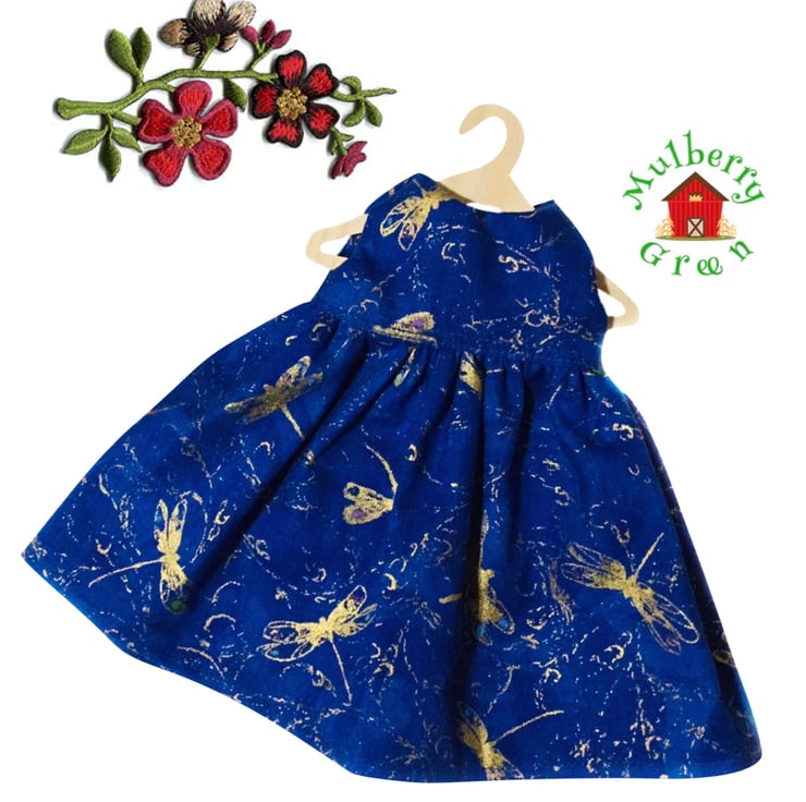 A beautiful royal blue and gold dragonfly dress to fit the Mulberry Green characters. The dress is made from best quality cotton in a beautiful dragonfly print and has a lined bodice and full gathered skirt. It comes on a little wooden hanger.