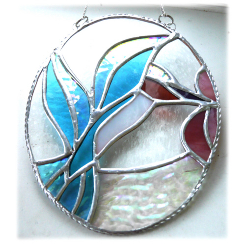 Please note that this suncatcher contains a high percentage of iridised glass. . It gives a wonderful effect. The solder near the iridised glass is more liable to slight tarnish than on non-iridised glass but this is not a fault and makes no difference as not visible when hanging in the light.