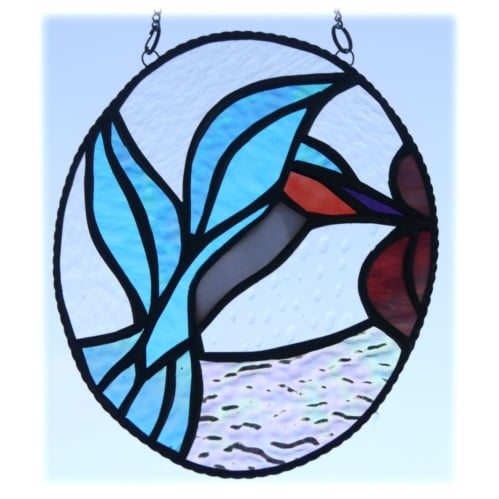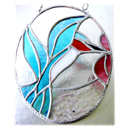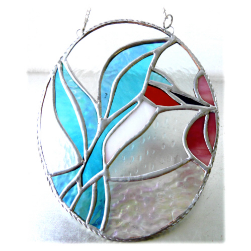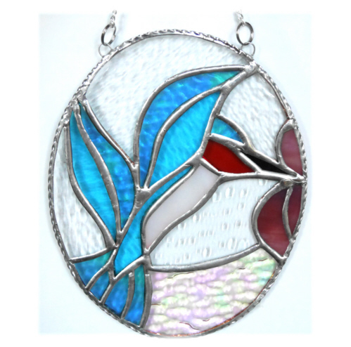 The suncatcher is in the form of an oval picture showing a bright shiny Kingfisher. The bird is fluttering its wings and has its beak in the middle of a bright Rose-Pink flower.
