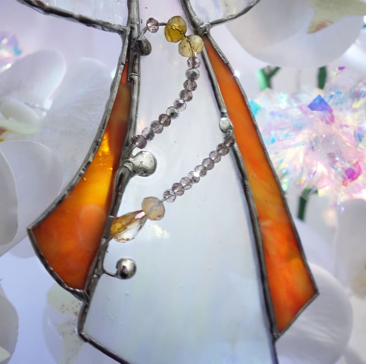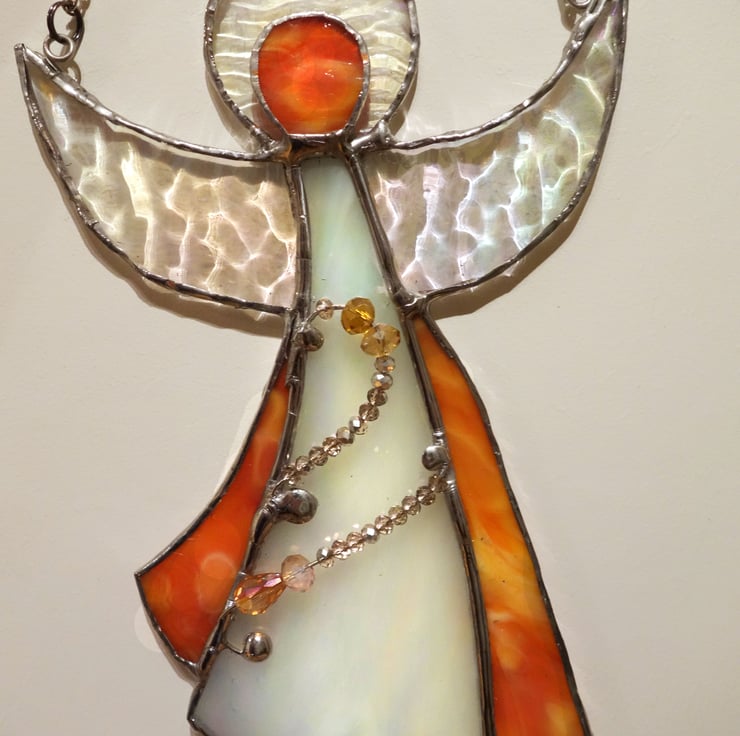 This pretty guardian angel is made from white wispy and tangerine ring mottle glass with wings of rippled iridescent clear glass. I've used fancy wire work coupled to crystal beads that twinkle and sparkle on her skirts. She hangs from a thin chain, and measures approx 8 inches long, and is attuned and dedicated with Reiki energy for your protection and positive vibes.
